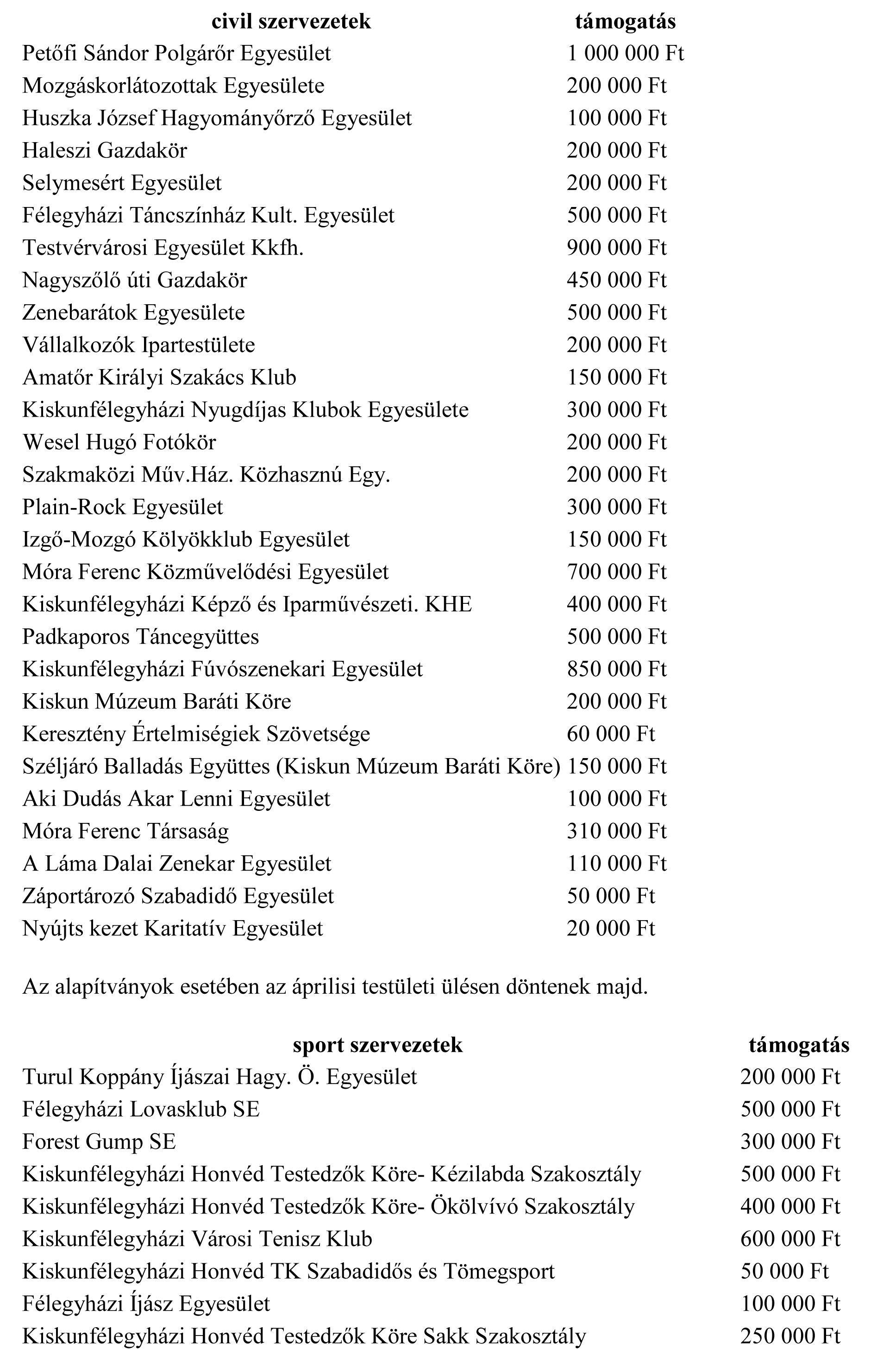 Kiskunfélegyháza Város Önkormányzata 2016. évben az alábbi sportszervezeteknek és civil szervezeteknek nyújt anyagi támogatást.