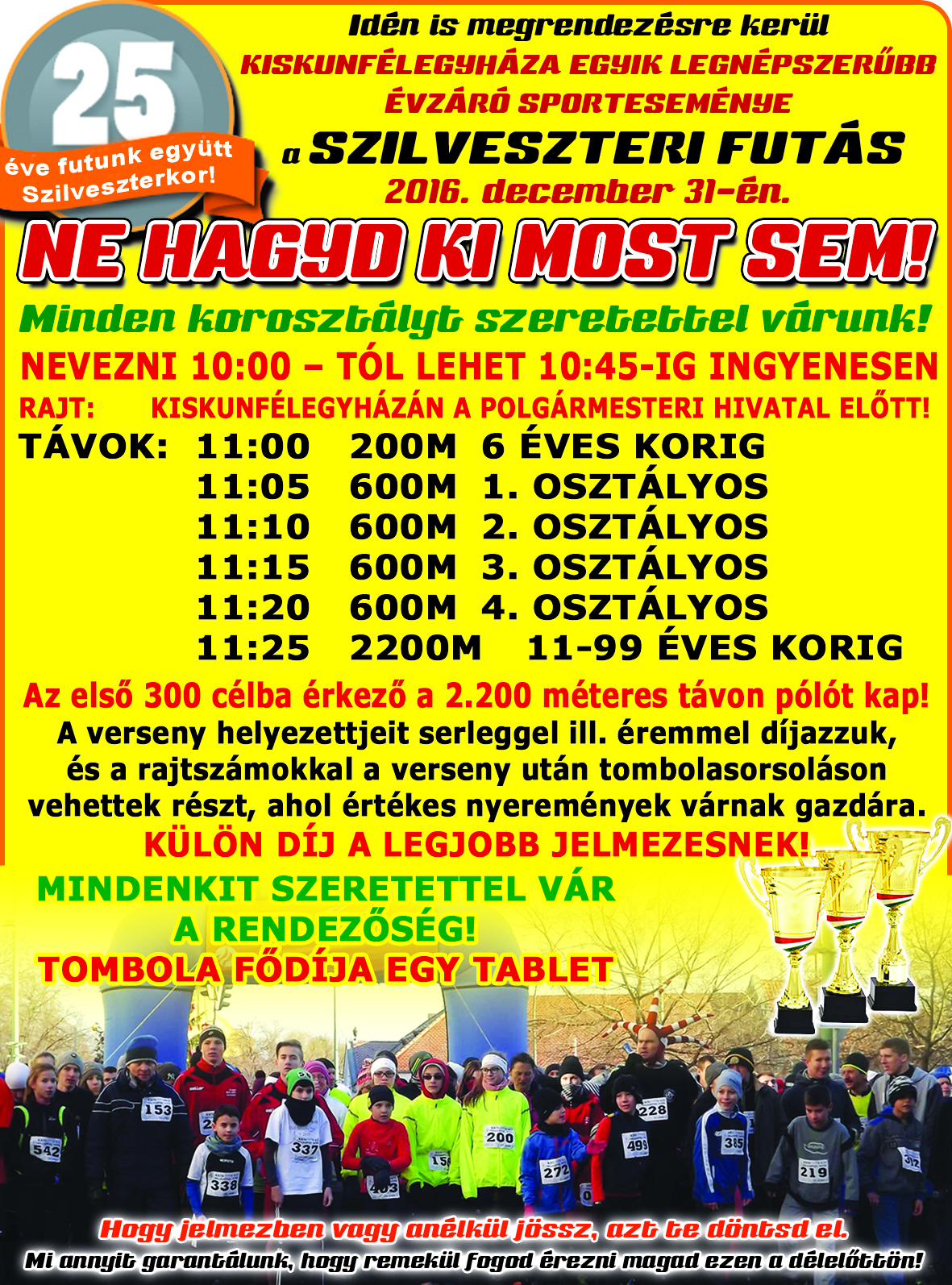 Ezúton tudatjuk kedves Olvasóinkkal és a sportbarátokkal, hogy a hagyományosnak számító évzáró sporteseményt mint eddig 25 éve mindig, a Szuperinfó Futóklub és a Félegyházi Szuperinfó Szerkesztősége szervezi!