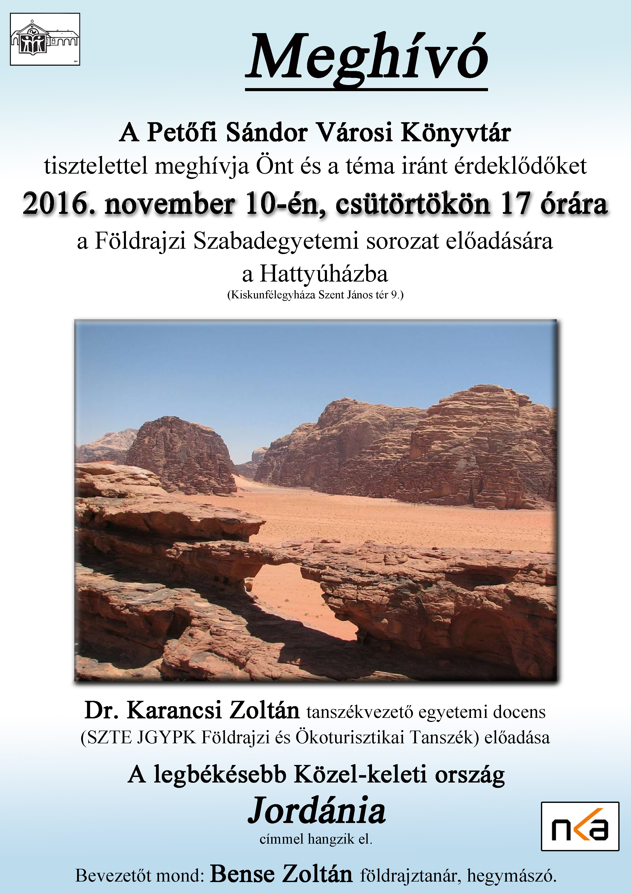 A Petőfi Sándor Városi Könyvtár tisztelettel meghívja Önt és a téma iránt érdeklődőket 2016. november 10-én, csütörtökön 17 órára a Földrajzi Szabadegyetemi sorozat előadására a Hattyúházba.