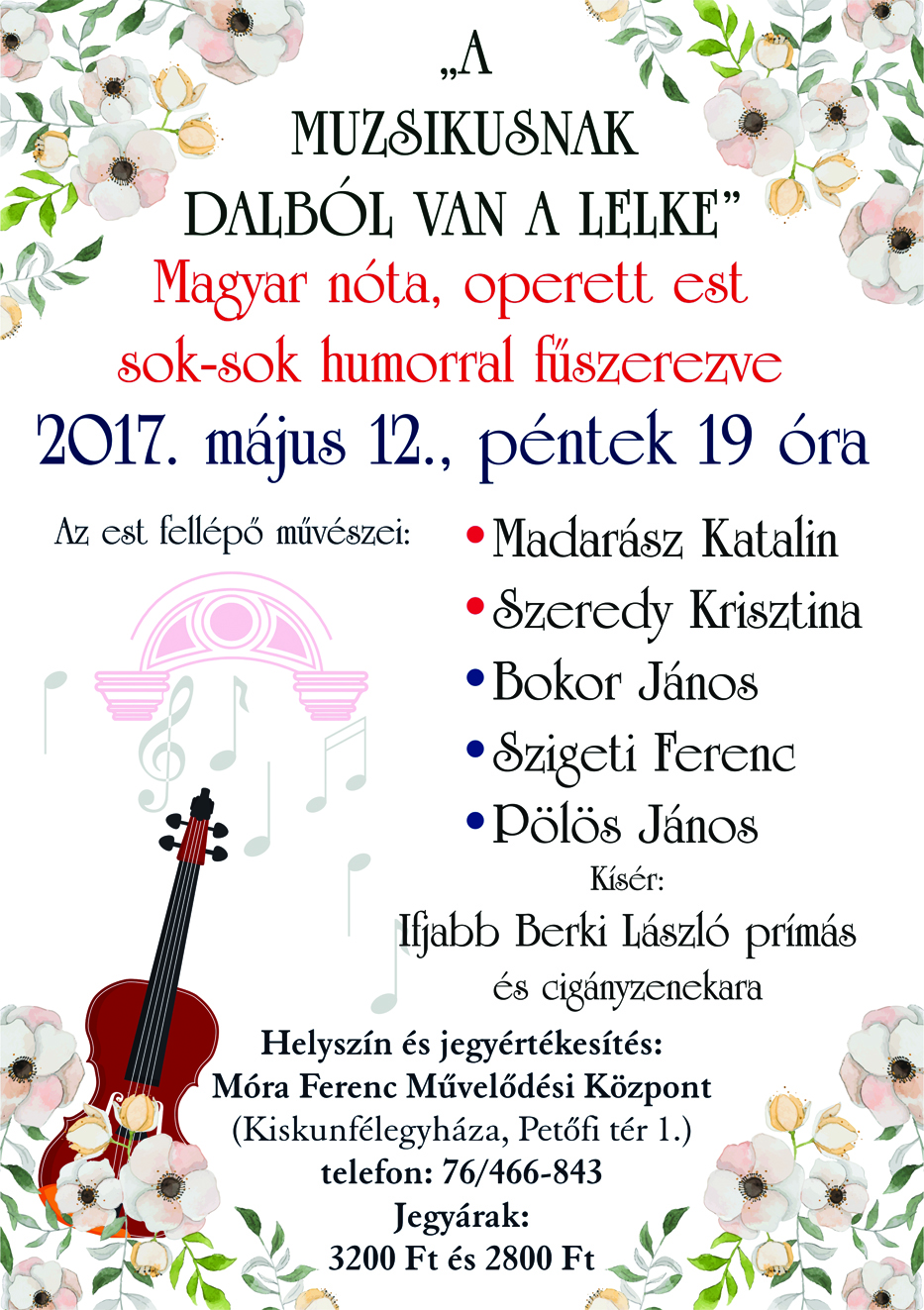 Magyar nóta és operett est sok-sok humorral fűszerezve 2017. május 12-én, pénteken 19 órakor a Móra Ferenc Művelődési Központban.