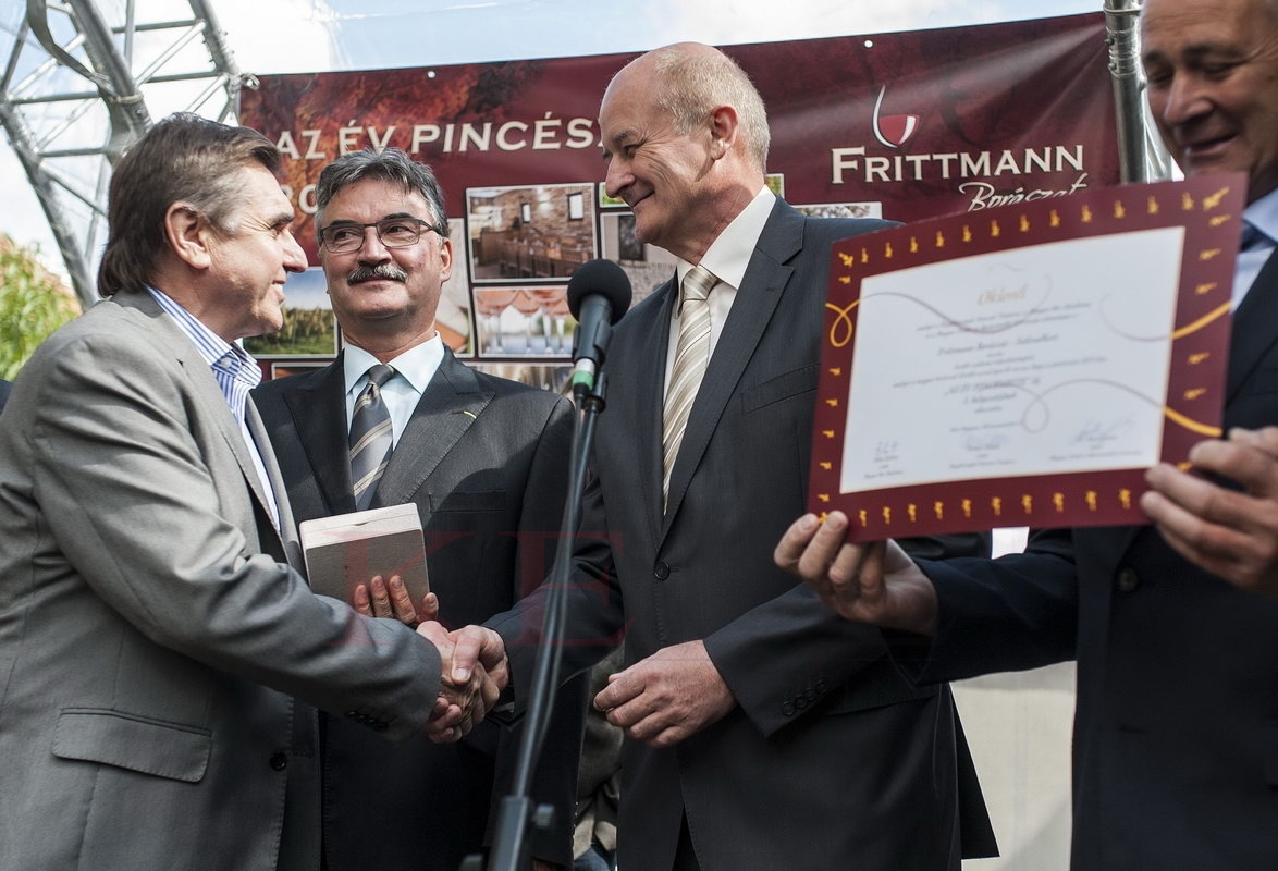 A fotón: Frittmann János borász (j2) átveszi az oklevelet az Év pincészete-díj átadóján Szőke Sándortól, a Duna Borrégió Szőlészek Borászok Egyesületének elnökétől (b) a nyertes Frittmann Borászat soltvadkerti telephelyén 2015. szeptember 8-án. A borászat a magyar borászszakma legrangosabb elismerését kapta meg, amelyet idén tizennegyedik alkalommal ítéltek oda.