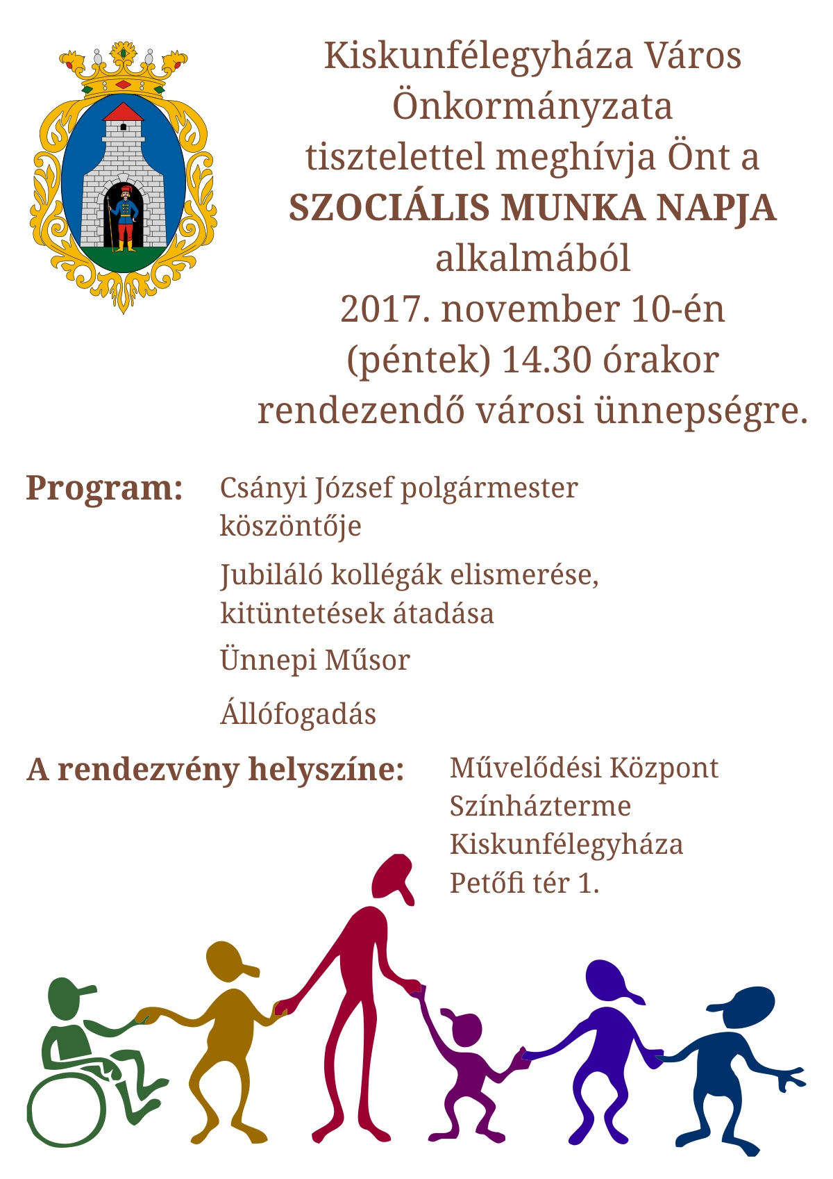 Kiskunfélegyháza Város Önkormányzata tisztelettel meghívja Önt a Szociális Munka Napja alkalmából 2017. november 10-én, pénteken 14.30 órakor rendezendő városi ünnepségre a Művelődési Központ Színháztermébe.