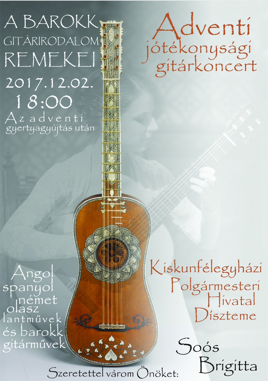 Soós Brigitta gitárművész előadásában a barokk gitárirodalom remekei hallhatók 2017. december 2-án, szombaton 18 órától a Polgármesteri Hivatal Dísztermében az első adventi gyertya meggyújtása után.