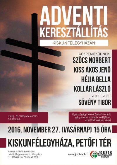 A Jobbik Kiskunfélegyházi Szervezete szeretettel hív mindenkit november 27-én, vasárnap 15 órakor az adventi keresztállításra.