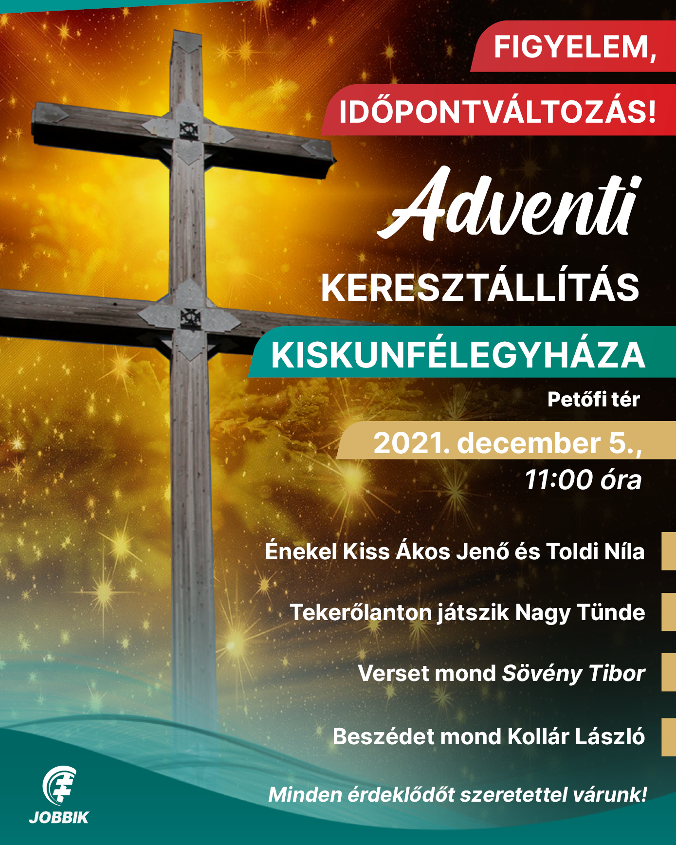 A Jobbik Magyarországért Mozgalom Kiskunfélegyházi Szervezete szeretettel hív mindenkit 2021. december 5-én, vasárnap 11 órakor az adventi keresztállításra.
