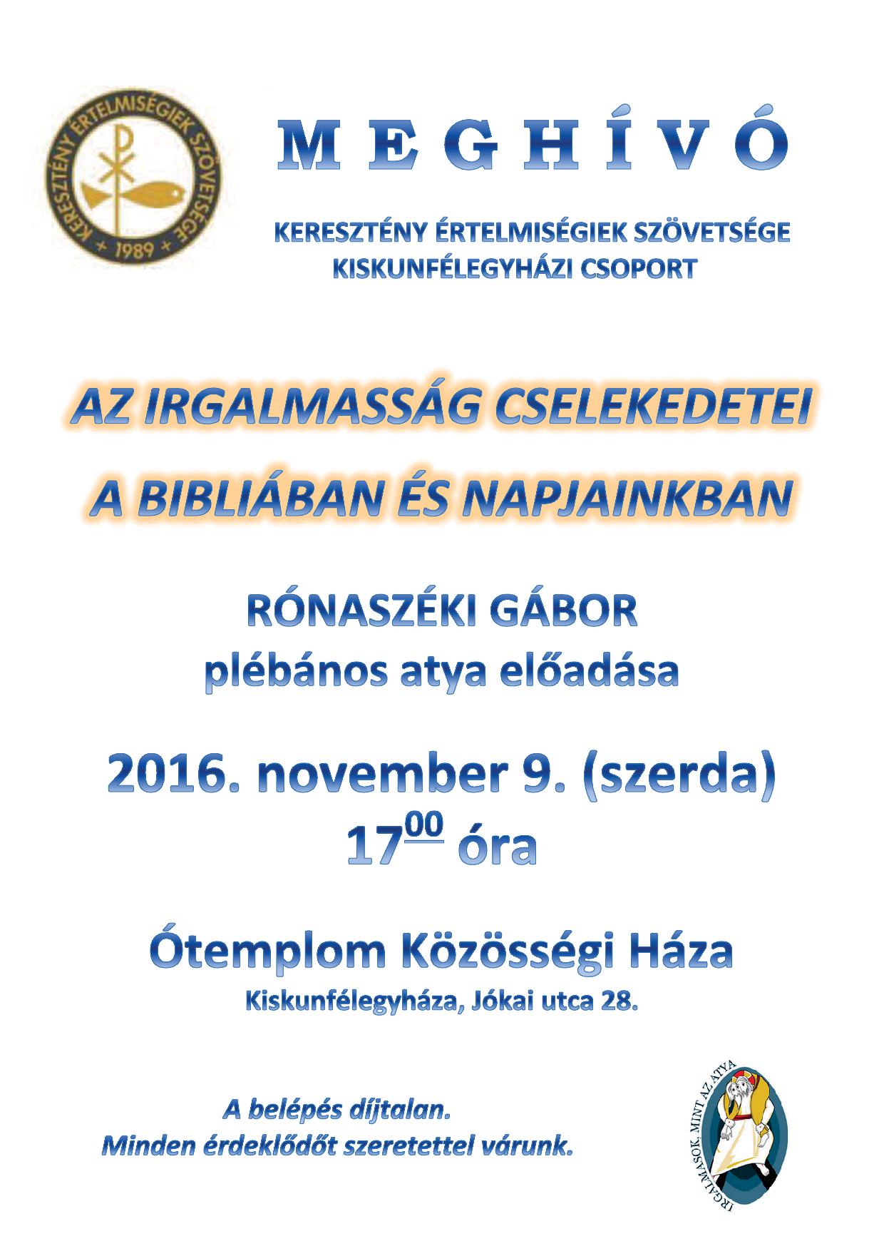 Minden érdeklődőt szeretettel várnak Rónaszéki Gábor plébános atya előadására 2016. november 9-én 17 órára az Ótemplom Közösségi Házába.
