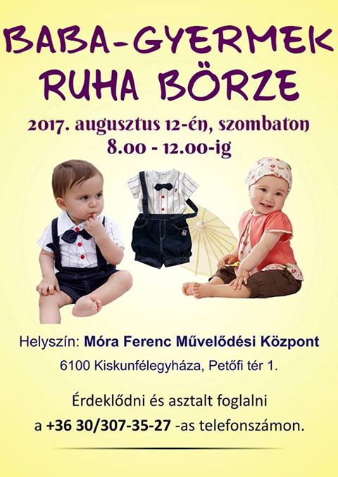 2017. augusztus 12-én, szombaton 8-12 óráig újra megrendezésre kerül a Baba és Gyermekruha börze, Kiskunfélegyházán a Móra Ferenc Művelődési Központban.