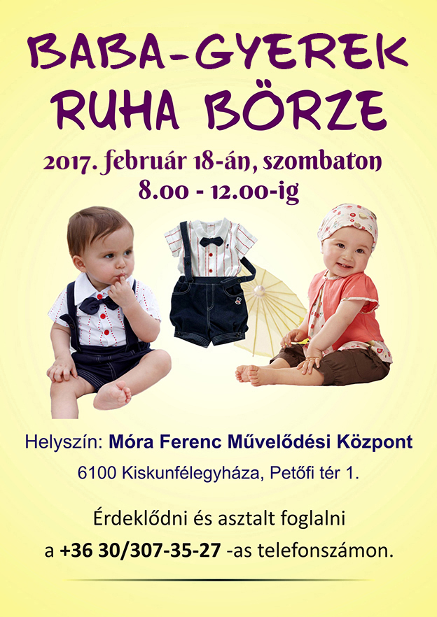 Ismét megrendezésre kerül a Móra Ferenc Művelődési Központban a Baba-gyerek ruhabörze 2017. február 18-án, szombaton 8-12 óráig.