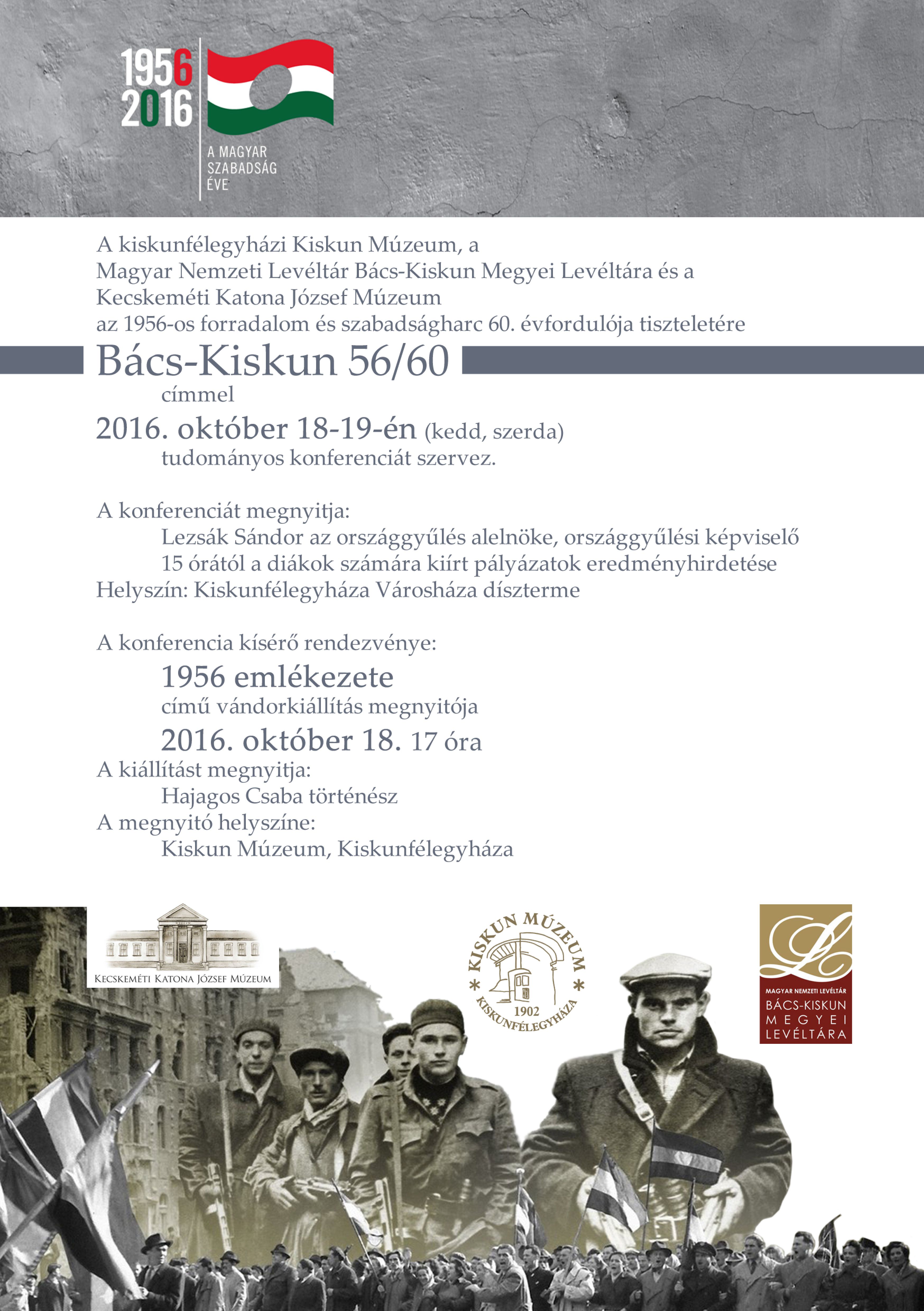 A Kiskun Múzeum, a MNL Bács-Kiskun Megyei Levéltára és a Kecskeméti Katona József Múzeum az 1956-os forradalom és szabadságharc 60. évfordulója tiszteletére BÁCS-KISKUN 56/60 címmel tudományos konferenciát szervez.
