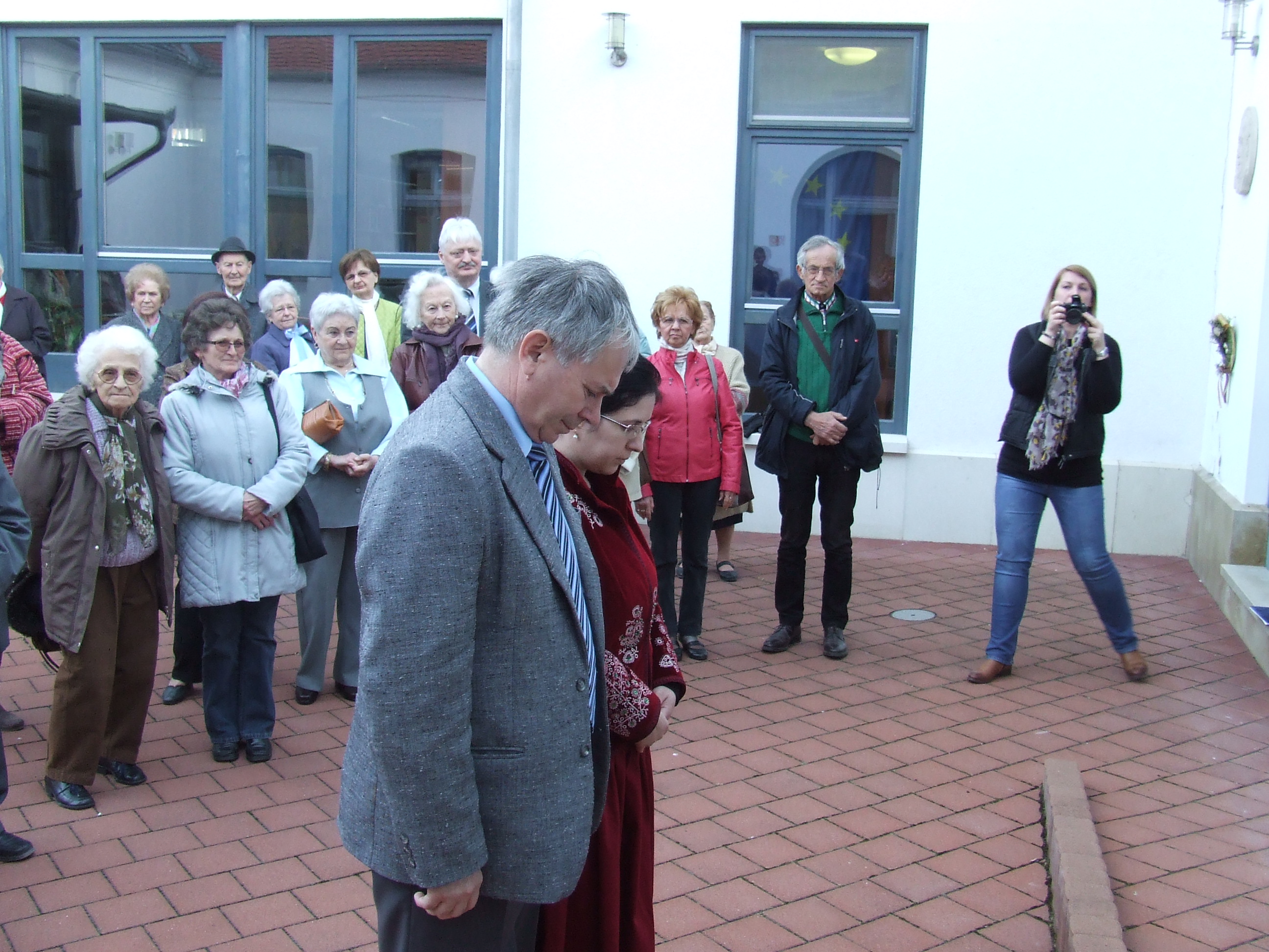 Ezt követően a Könyvtár udvarán Emléktábla-avatás következett. Reményik Sándor költői munkásságának tiszteletére domborművet helyeztek el a Hattyúház falán. A táblát dr. Tarjányi József és Kollár László leplezte le, avatóbeszédet dr. Ónodi Izabella, a Művelődési és Ifjúsági Bizottság elnöke mondott. Balla László alpolgármester úr megkoszorúzta a leleplezett plakettet. Végül az emléktábla-avatás egy Reményik vers elszavalásával - Mező Gábor közreműködésével - zárult..