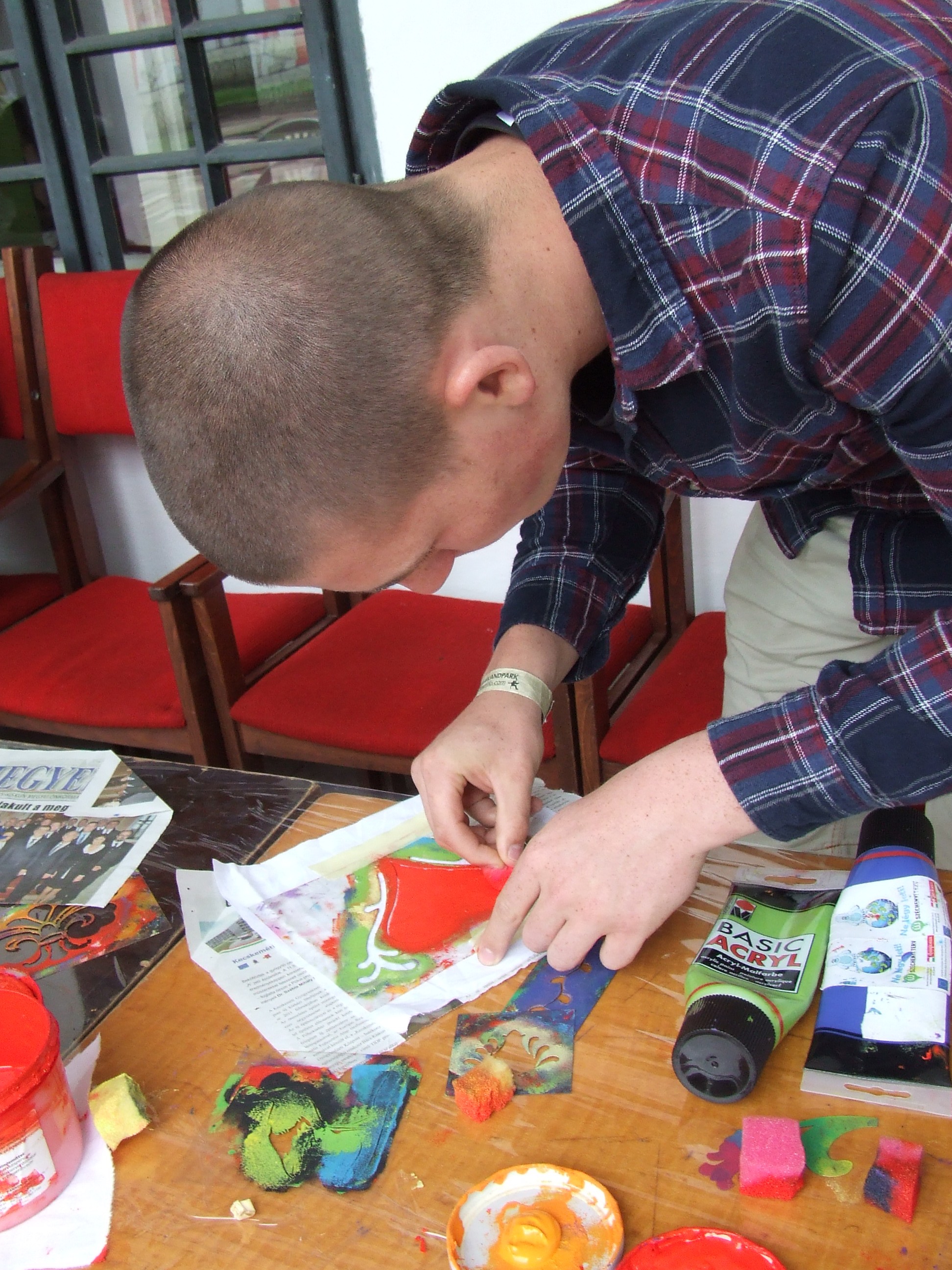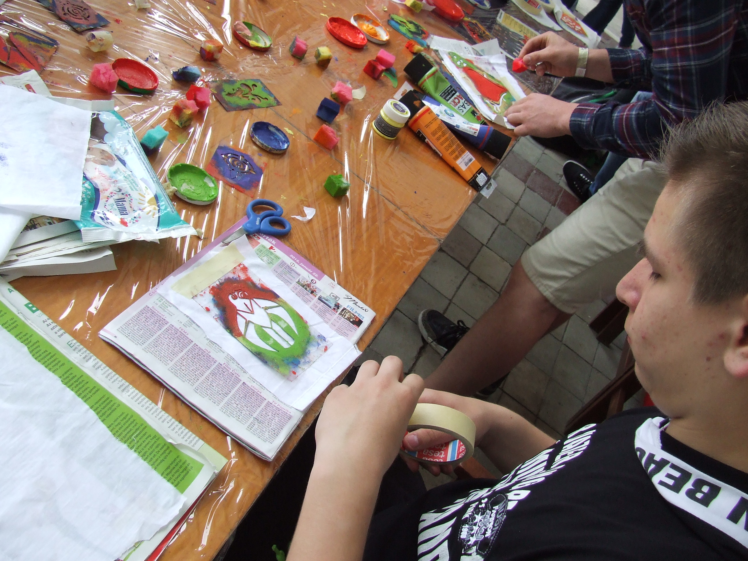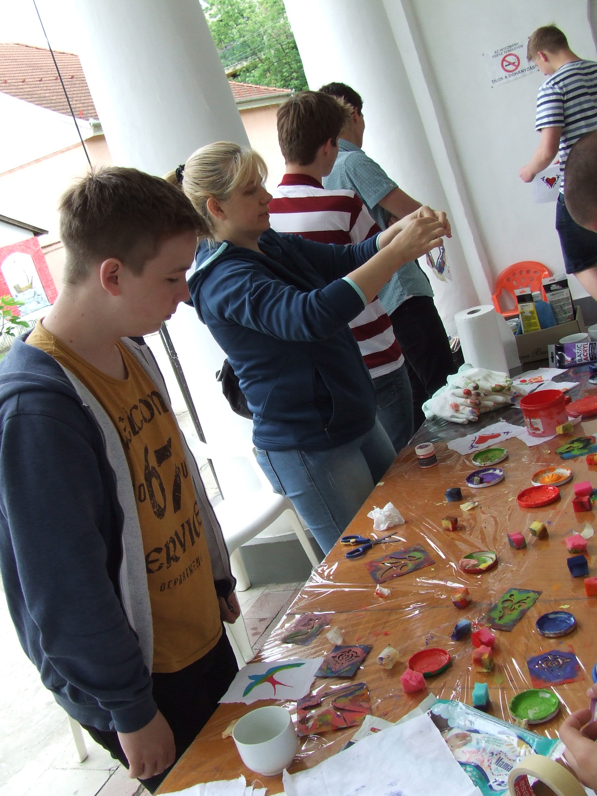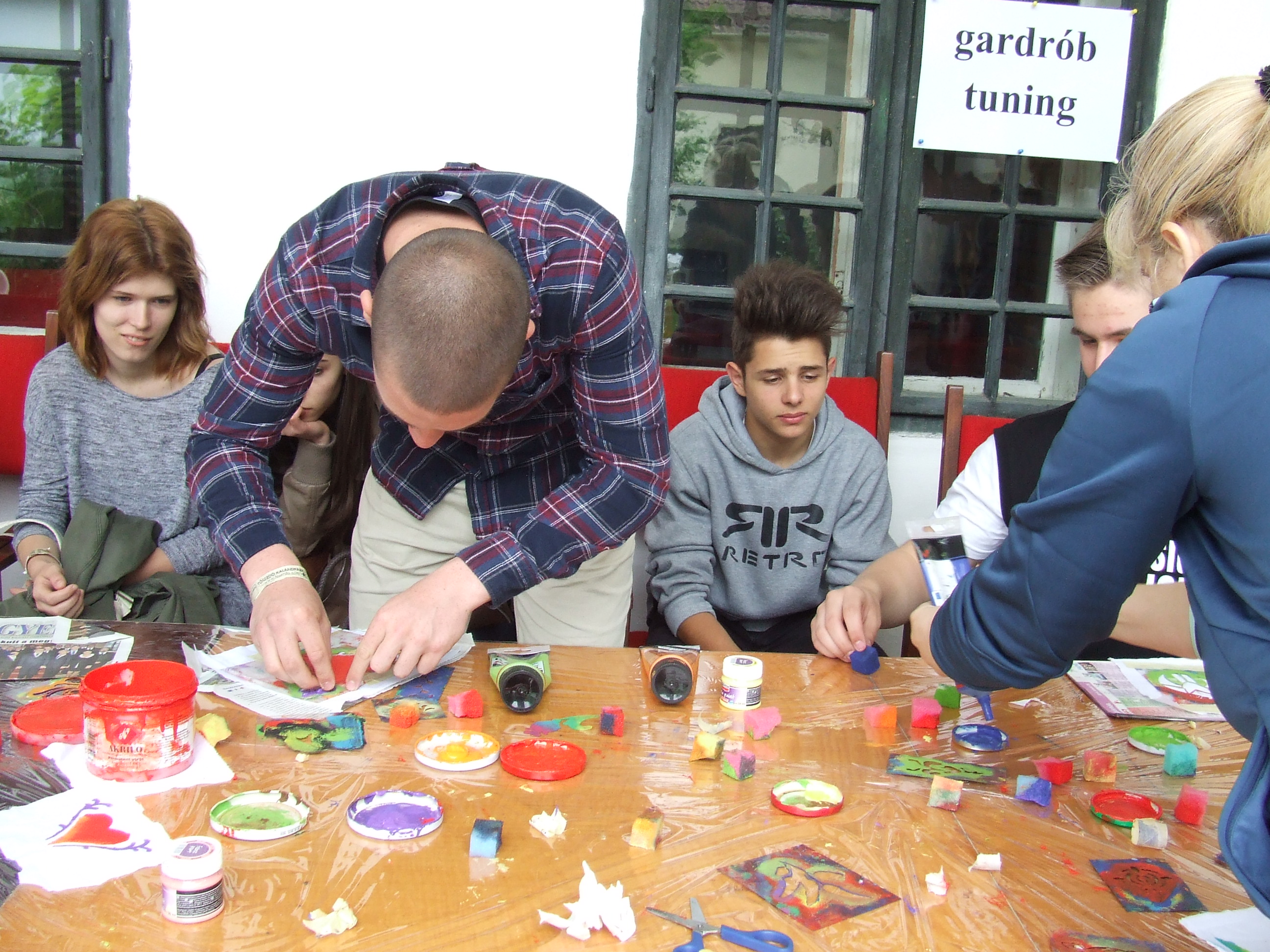 A gardrób tuning kézműves asztalnál is tolongtak a fiatalok. Fiúk, lányok egyforma érdeklődéssel bíbelődtek a jellegzetes kiskunfélegyházi motívumokkal. Remek kézügyességgel festegették ki a sablonokat.