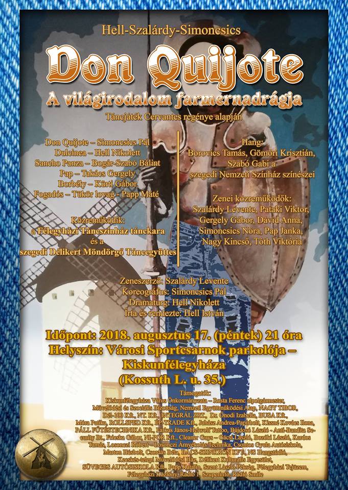 A Félegyházi Táncszínház és a szegedi Délikert Möndörgő Táncegyüttes 2018. augusztus 17-én 21 órától bemutatja a "Don Quijote a világirodalom farmernadrágja" című táncjátékot, melyre mindenki szeretettel várnak.