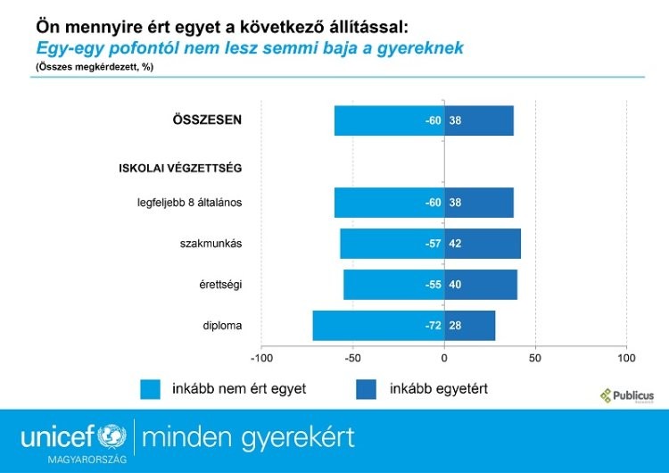 A kutatás eredményei alapján bőven van még tennivaló a bántalmazáshoz fűződő attitűdökkel kapcsolatban, a testi fenyítést elfogadók viszonylagosan magas aránya különösen aggodalomra ad okot. Reméljük, hogy a kampány a szemléletformálásban is segít majd - mondta Szlankó Viola, az UNICEF Magyarország gyermekjogi szakértője.