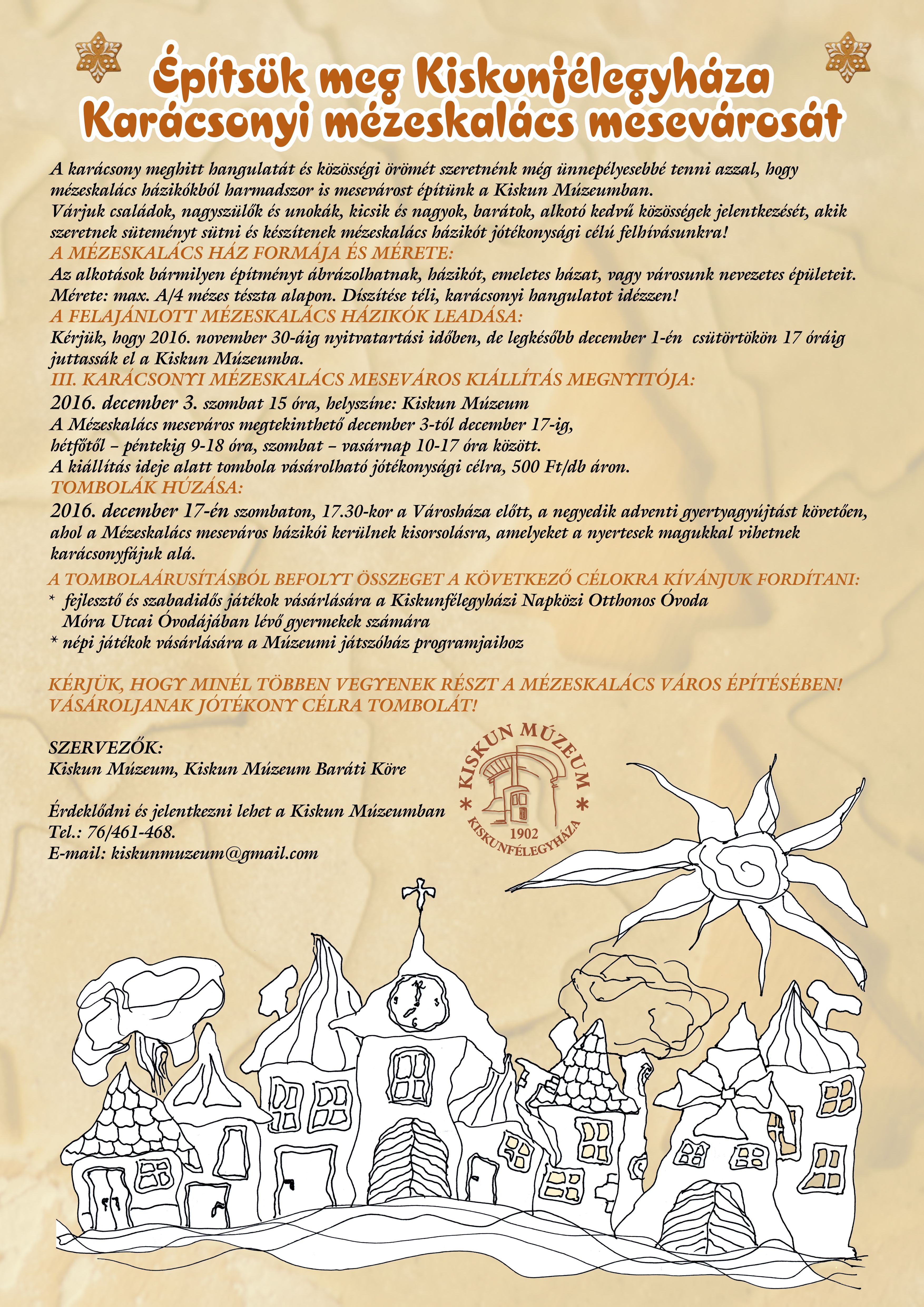 A karácsony meghitt hangulatát és közösségi örömét szeretnénk még ünnepélyesebbé tenni azzal, hogy mézeskalács házikókból harmadszor is mesevárost építünk a Kiskun Múzeumban.