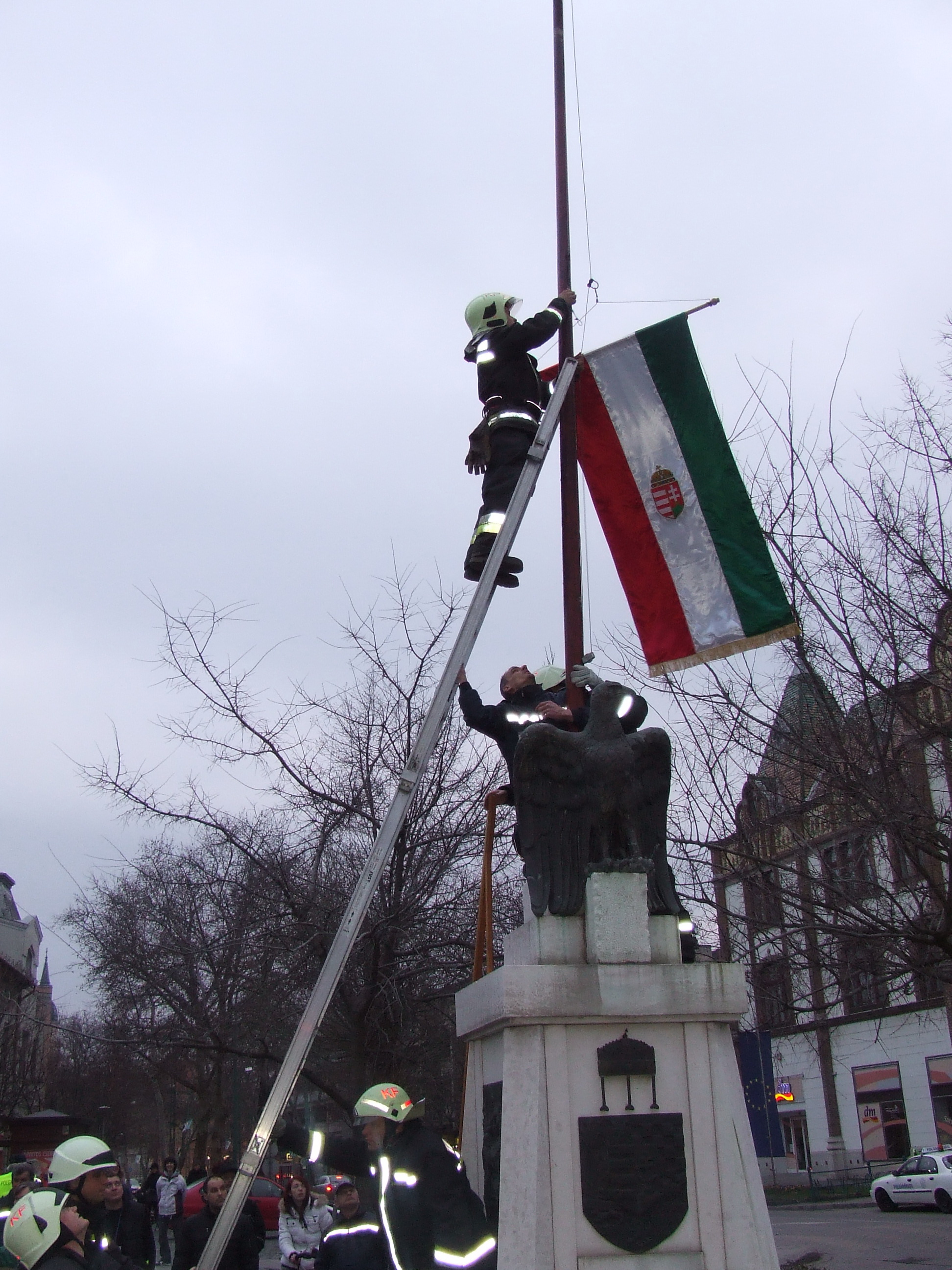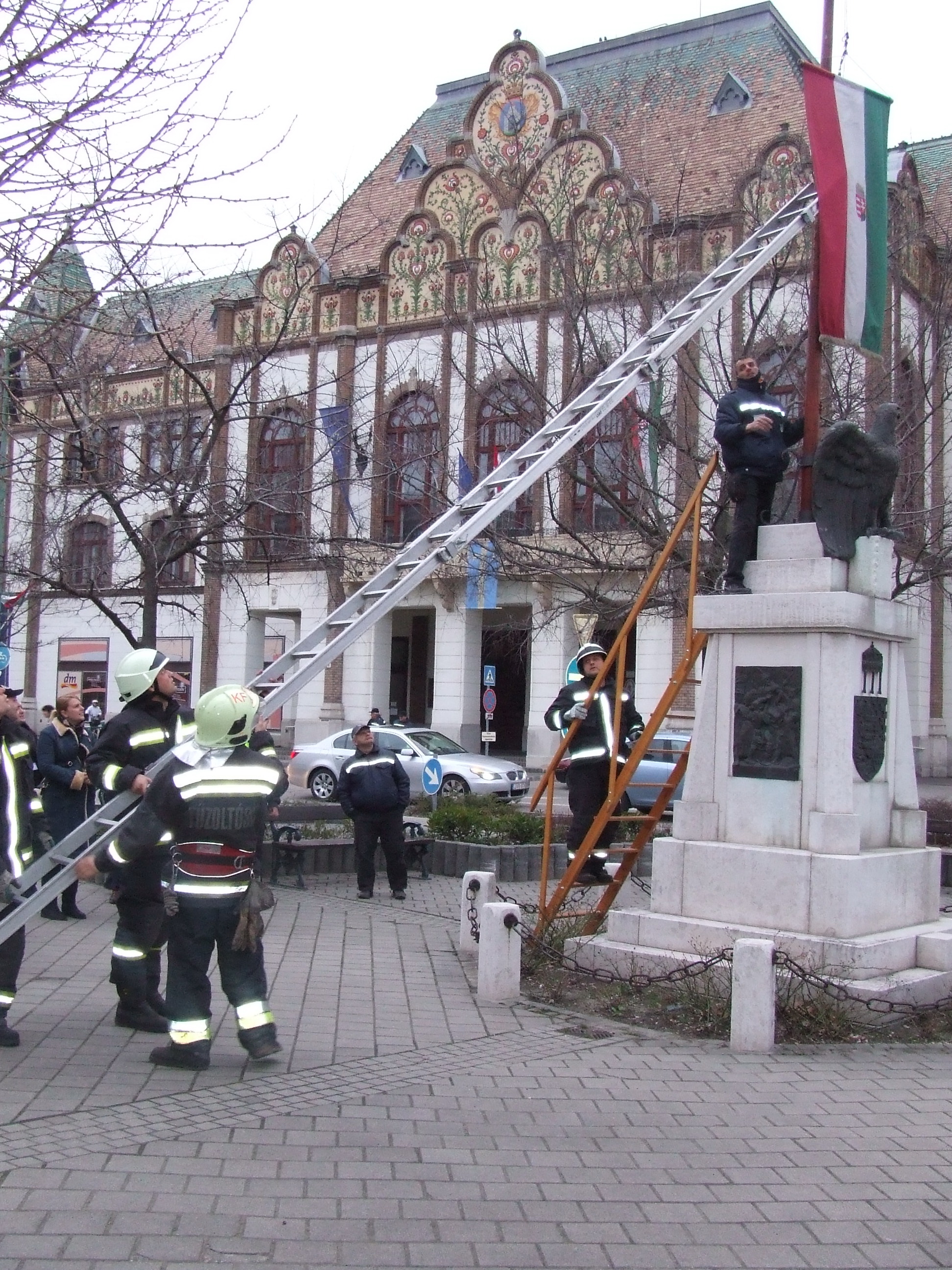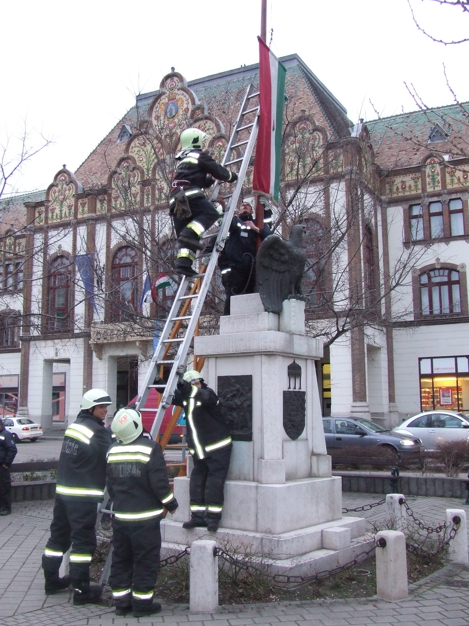 Idén a Tűzoltóságot is be kellett vonni a feladatba, mert a zászló felvonó zsinórja az utóbbi idők szeles időjárásának következtében annyira összegabalyodott, hogy nem lehetett sem le, sem felhúzni a zászlót. A segítségkérést követően pár perc múlva kivonultak a tűzoltók és pillanatok alatt megoldották a problémát.