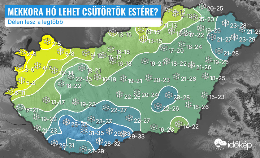 Csütörtökre az ország déli, délkeleti harmadát nagy területen 20, a déli tájakat 30 centimétert meghaladó vastagságú hótakaró fedheti be - olvaható azidokep.hu-n.