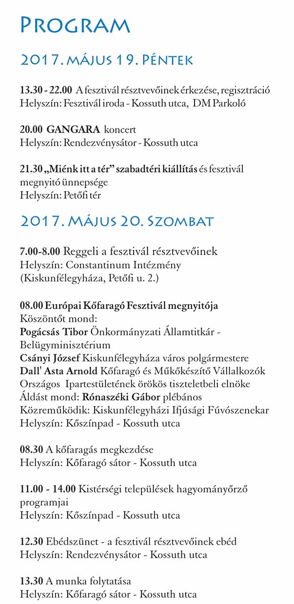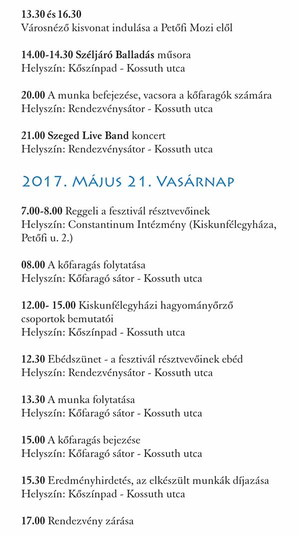 2017. május 19-21. között Kiskunfélegyháza fogadja a közel 150 kőfaragót és kőszobrászt az egész világból, ahol nagyszerű lehetőség van tudásuk és kreativitásuk megmutatására a szélesebb nyilvánosság előtt.