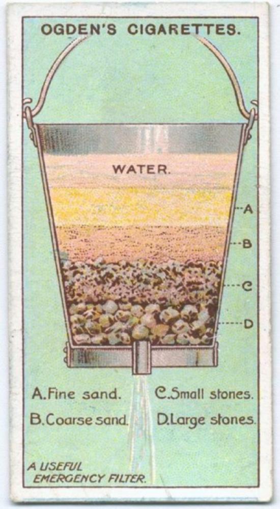 Ha valaha is ivóvíz hiány lenne, fogj egy tiszta vizes vödröt, csinálj az aljára egy lyukat. helyezz el benne egy kis csövet, töltsd meg nagyobb kavicsokkal, kis kavicsokkal, durva és finom homokkal egymás fölé rétegezve. A víz a rétegeken átfolyva megtisztul a szennyeződéstől és tiszta vizet nyerünk.