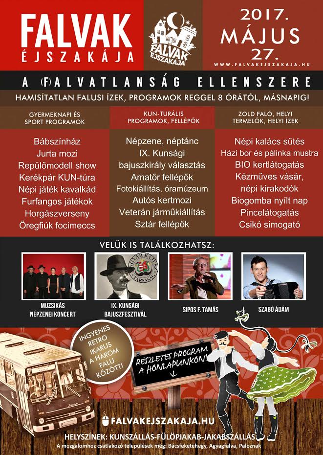 Szeretettel várnak minden kedves vendéget 2017. május 27-én a kunszállási, fülöpjakabi, jakabszállási Falvak Éjszakája program kavalkádjaira.