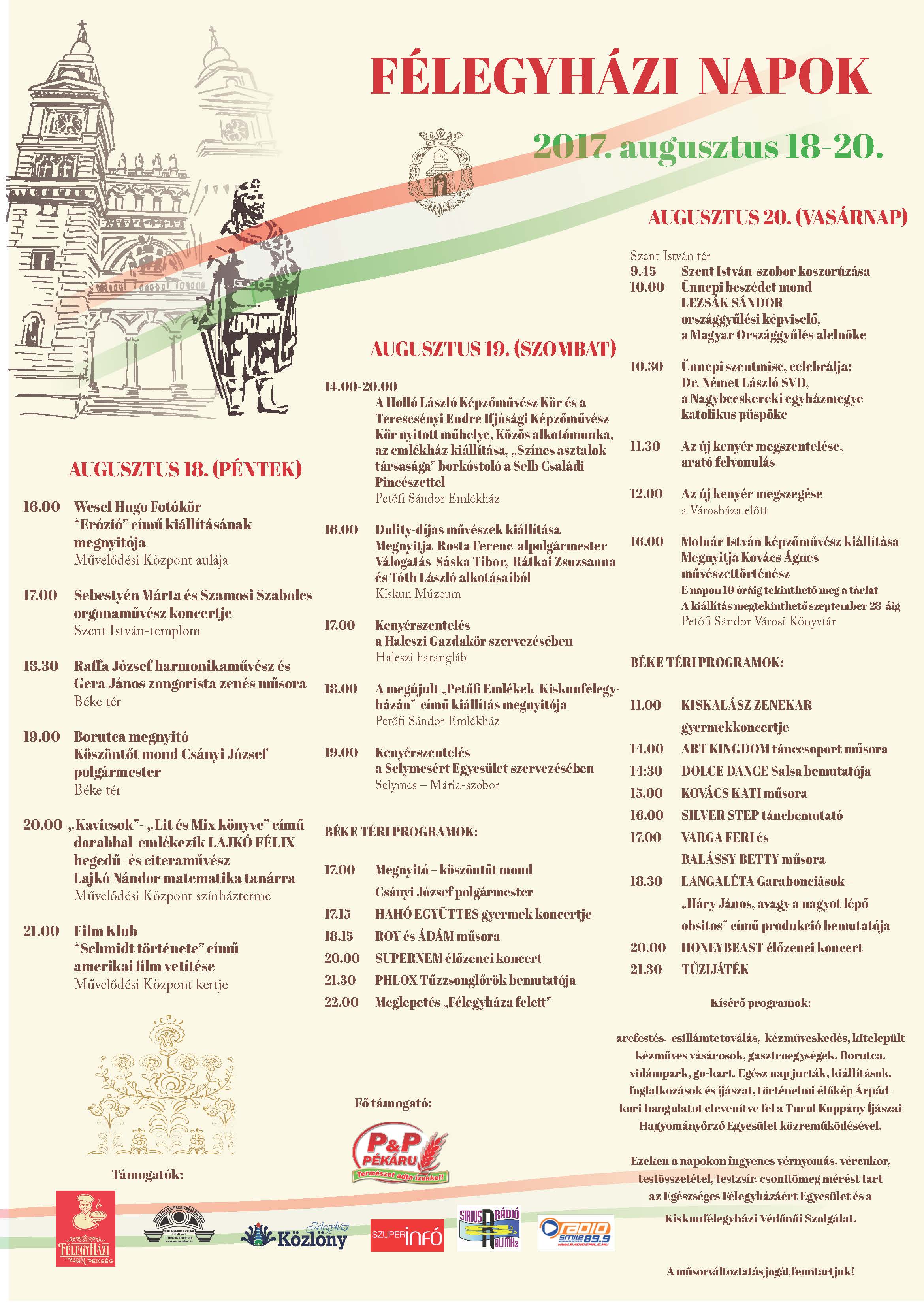 Kiskunfélegyháza Város Önkormányzata és a Móra Ferenc Művelődési Központ szeretettel meghívja Önt és kedves családját az augusztus 18-20-a között megrendezésre kerülő Félegyházi Napok rendezvényeire.