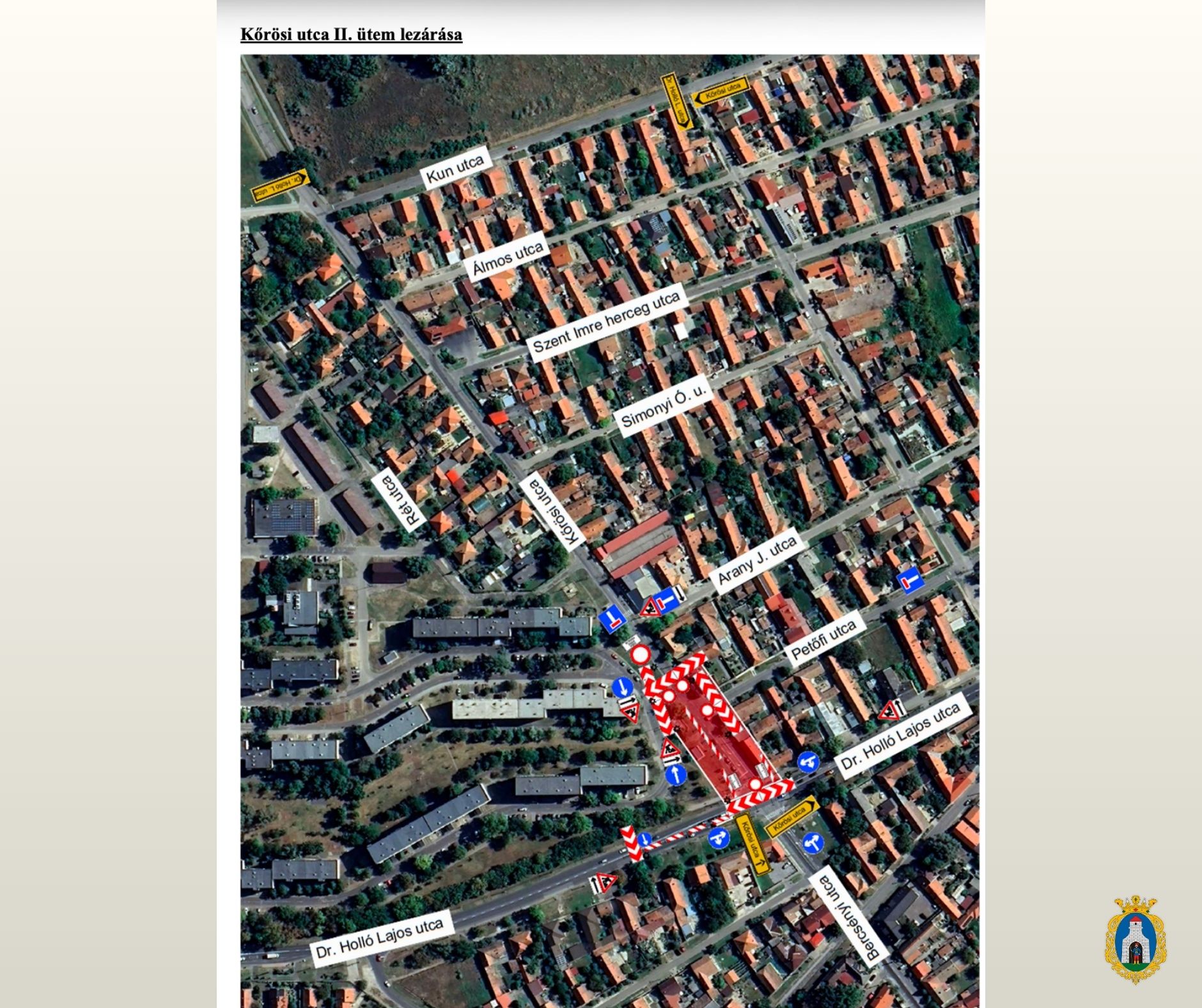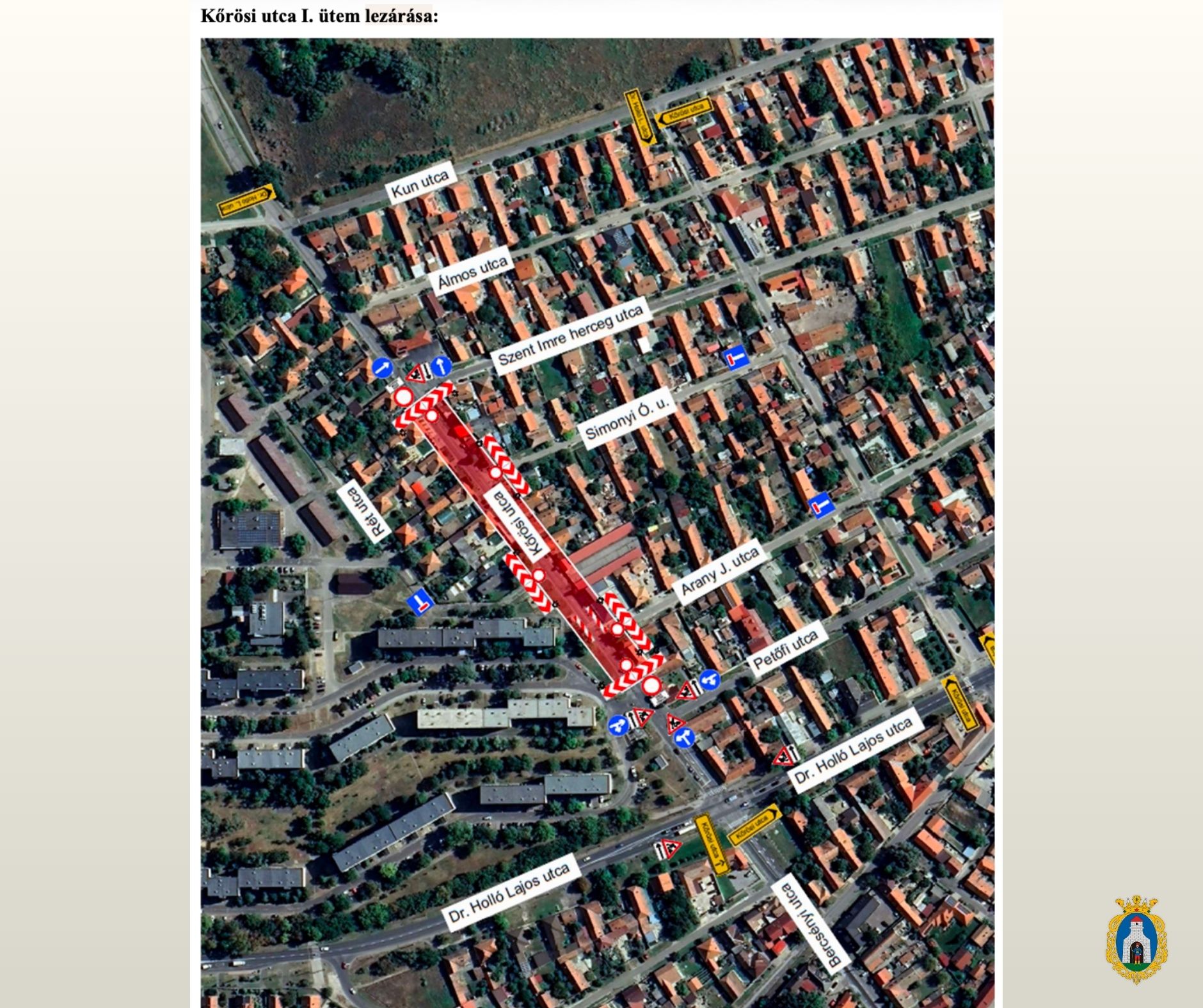 A kivitelezés következő ütemében szakaszosan lezárják a Kőrösi utca azon részét, amely a Szent Imre herceg utca és a Dr. Holló Lajos utca – az 5. számú főút csomópontja – között helyezkedik el. A lezárások a munkálatok előrehaladásához igazodnak, így időszakosan változhatnak.