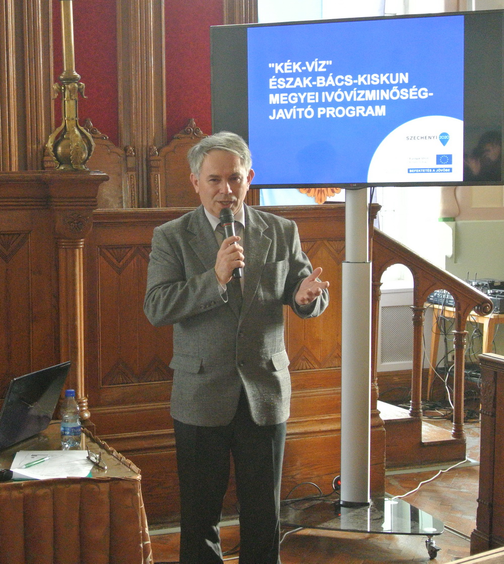 Balla László alpolgármester elmondta, a „Kékvíz” Észak-Bács-Kiskun Megyei Ivóvízminőség-javító Program egy 12 milliárdos projekt, melyből Kiskunfélegyháza és a kistérség egy „mini-projekt” keretében mintegy 2,3 milliárd forint támogatásban részesül, melynek köszönhetően minden környékben élő ember tiszta, arzénmentes vizet ihat. A projekt műszaki tartalmát Kecskés Nóra kommunikációs munkatárs ismertette. Mint elmondta, Kiskunfélegyházán regionális szintű ivóvíz ellátó rendszer épül ki, ahonnan a jövőben Petőfiszállás, Pálmonostora és Pálmonostora-Aranyhegy, Gátér, Fülöpjakab, valamint Kiskunfélegyháza-Aranyhegy ellátása is történik. A Félegyházi „mini projekt” keretében megvalósul a kiskunfélegyházi II. számú vízműtelep nyomásfokozó gépház felújítása, kialakítanak egy új mélyfúrású kutat az Alpári úti vízbázison, megújulnak meglévő kutak, rekonstruálnak mintegy 8,7 km hosszúságú meglévő ivóvízhálózatot, valamint új 1500 köbméteres vasbeton víztorony is épült nyomásfokozó rendszerrel a Petőfi Lakótelep melletti területen. Megoldódik továbbá Halesz és Selymes térségének ivóvízellátása, aminek a keretében megépül mintegy 82 km regionális táv-, és ellátó vezeték, és két darab új acélszerkezetű víztorony építésére kerül sor Fülöpjakabon, illetve Gátéron. A projektet várhatóan május végén zárják.