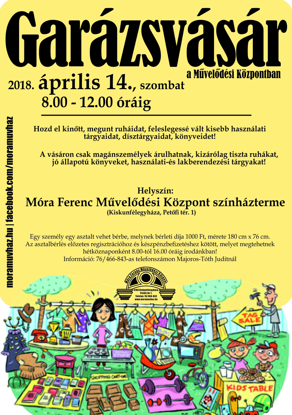 2018. április 14-én, szombaton 8-12 óráig Garázsvásár lesz a Móra Ferenc Művelődési Központ színháztermében, melyre mindenkit szeretettel várnak.