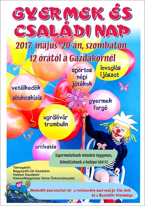 2017. május 20-án, szombaton 12 órától gyermek és családi nap Kiskunfélegyházán a Gazdakörnél. Színes programokkal várják a kicsiket és nagyokat.