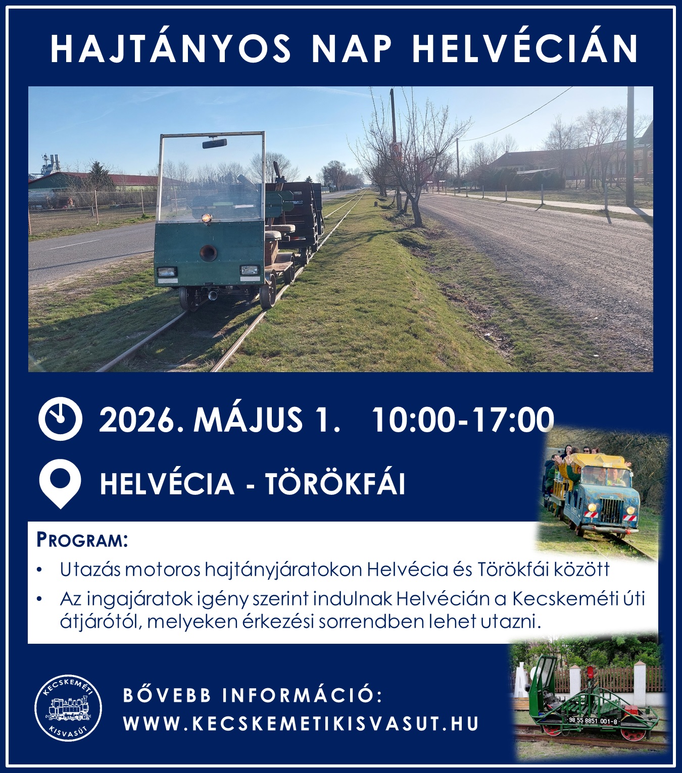 A program helyszíne a helvéciai Kecskeméti úti átjáró, ahonnan folyamatosan indulnak majd motoros hajtányjáratok a Hetes sor és Törökfái állomás irányába. A járatokra az érkezési sorrend alapján lehet felszállni, így érdemes időben érkezni azoknak, akik biztosan szeretnének utazni a nosztalgikus hangulatú pályaszakaszon.