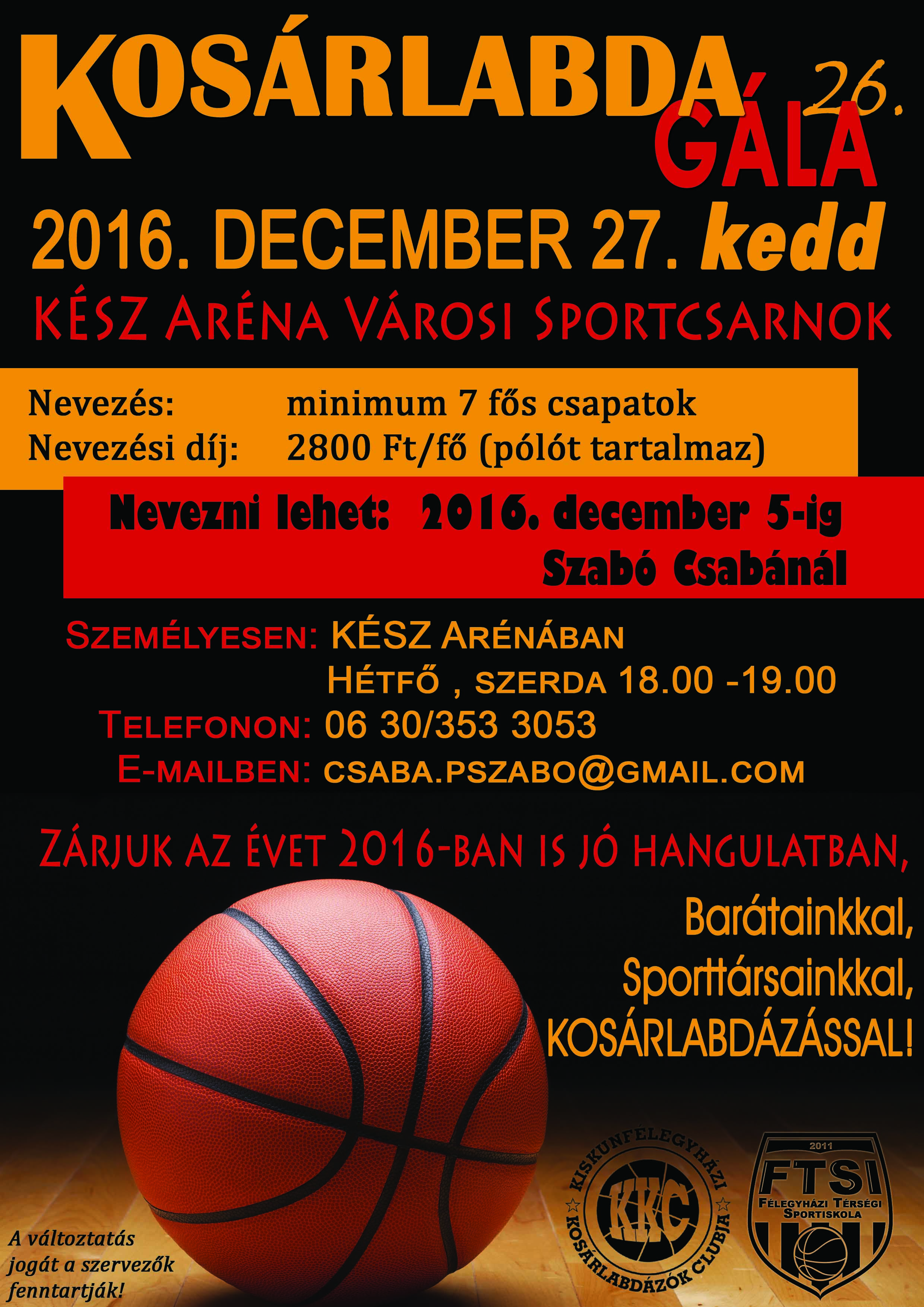 2016. december 27-án (kedd) minden kedves szurkolót és sportbarátot várunk szeretettel a KÉSZ Aréna Sportcsarnokba az idén is megrendezésre kerülő Kosárlabda Gálára.