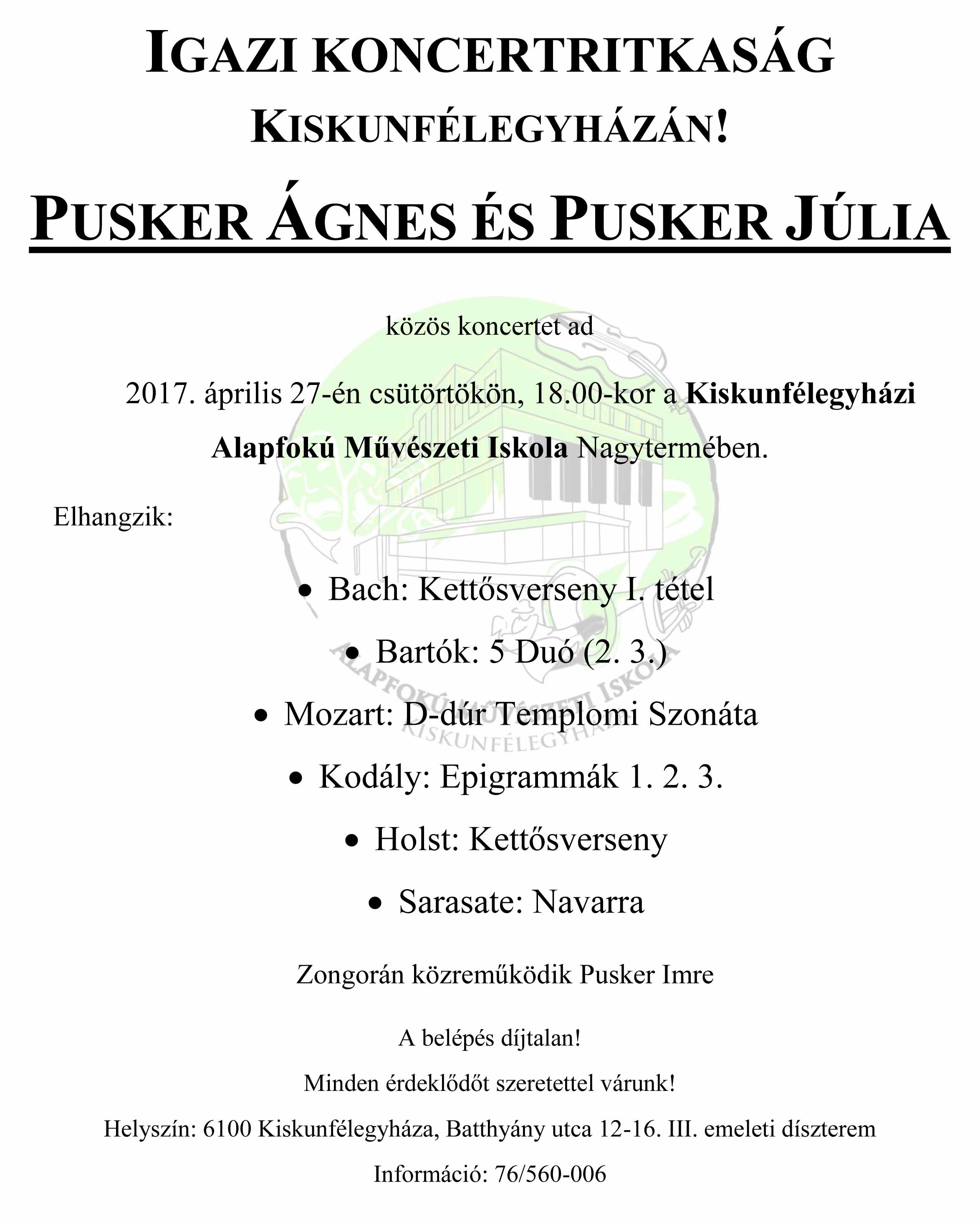 Pusker Ágnes és Pusker Júlia közösen ad koncertet 2017. április 27-én, csütörtökön 18 órakor a Kiskunfélegyházi Alapfokú Művészeti Iskola Nagytermében.
