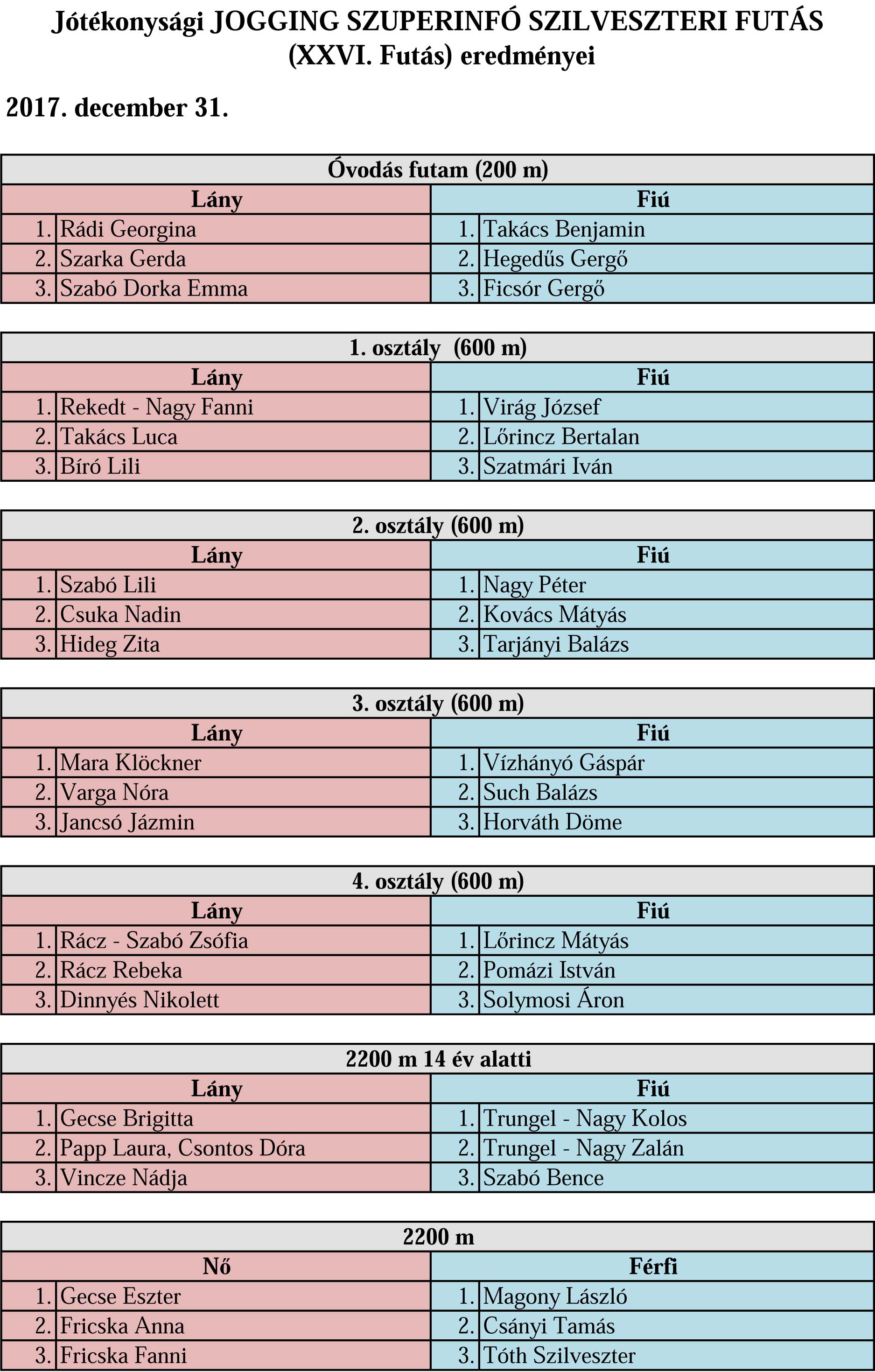 Jótékonysági Jogging Szuperinfó Szilveszteri Futóverseny eredményei