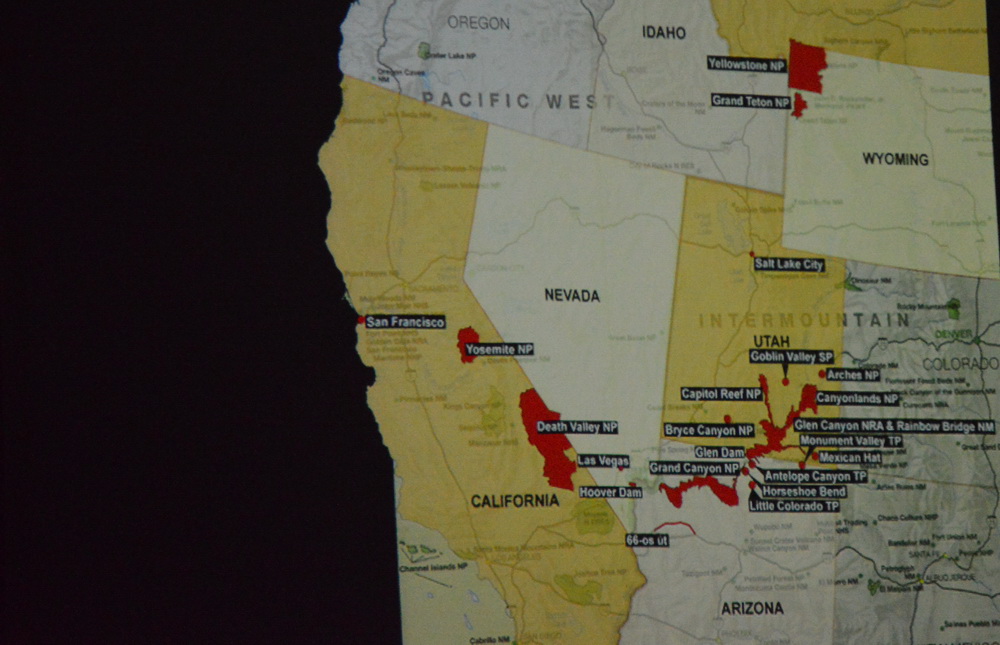 Az SZTE JGYPK Földrajzi és Ökoturisztikai tanszékvezetője ezt követően részletesen beszélt élményeiről. Elmondta, három hét alatt húszezer kilométert tett meg repülővel, hétezer kilométert autózott az USA három államában (California, Utah, Arizona), ahol kilenc nemzeti parkot, kilenc természetvédelmi területet barangolt be és három városban (San Fancisco, Las Vegas, Salt Lake City) járt. Egyebek között megtekintette a Yellowstone parkot, a Grand kanyont is.