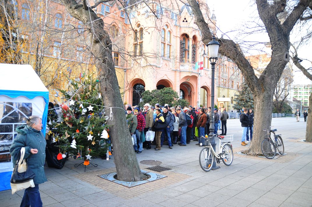 Karácsonyi ebédosztás Kecskemét főterén