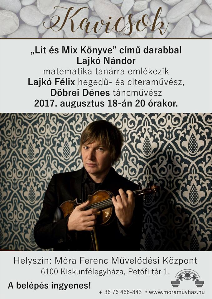 „Lit és Mix Könyve” című darabbal Lajkó Nándor matematika tanárra emlékezik Lajkó Félix hegedű- és citera művész, Döbrei Dénes táncművész 2017. augusztus 18-án 20 órakor a Móra Ferenc Művelődési Központban.