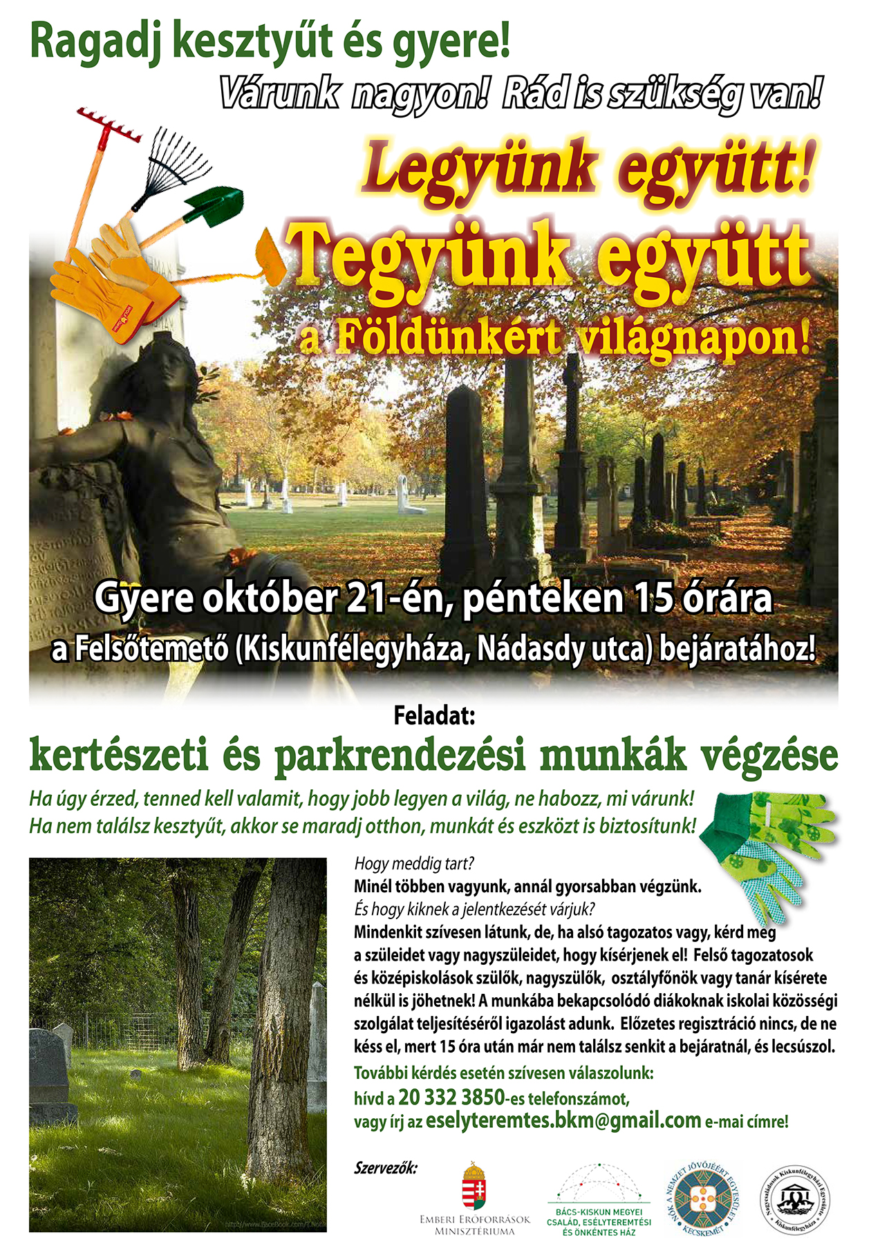 A program során október 21-én, pénteken 15 órától kertészeti és parkrendezési munkákat végeznek a kiskunfélegyházi Felsőtemetőben (Nádasdy utca).