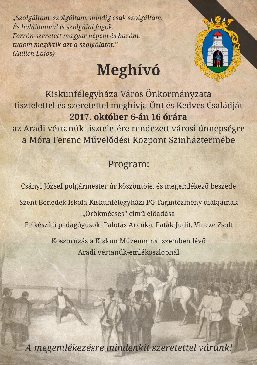 Kiskunfélegyháza Város Önkormányzata tisztelettel és szeretettel meghívja Önt és Kedves Családját 2017. október 06-án 16 órára az Aradi vértanúk tiszteletére rendezett városi ünnepségre a Móra Ferenc Művelődési Központ Színháztermébe.