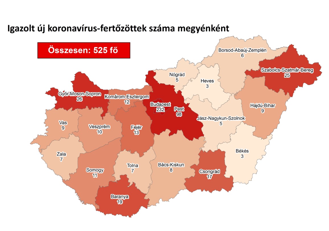 Újabb magyar állampolgároknál mutatták ki az új koronavírus-fertőzést (COVID-19), ezzel 525-re nőtt a hazánkban beazonosított fertőzöttek száma és elhunyt négy krónikus betegséggel küzdő idős beteg. Mind a négy személy szív- és érrendszeri alapbetegségben szenvedett. Az elhunytak száma ezzel 20 főre nőtt, de 40 főre emelkedett a gyógyultak száma is.