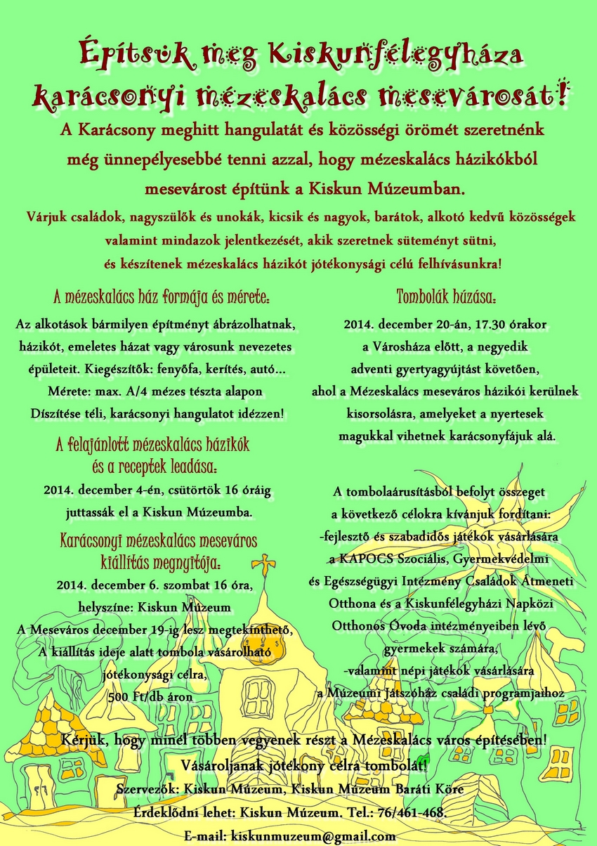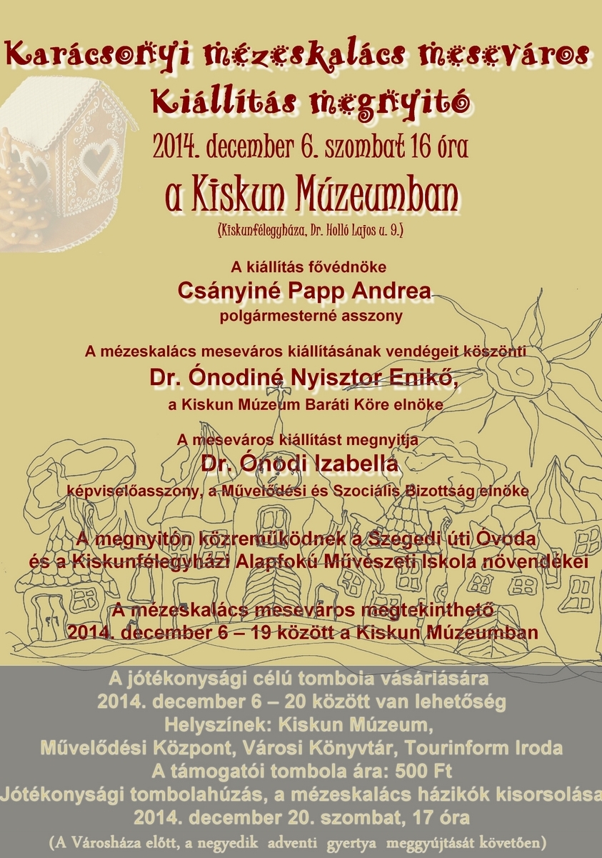 A kezdeményezők, a Kiskun Múzeum és a Kiskun Múzeum Baráti Köre december 4-én 16 óráig várják az alkotásokat, melyből december 6-án 16 órakor nyílik kiállítás a Kiskun Múzeumban. A mesevárost december 19-ig tekinthetik meg az érdeklődők az intézmény nyitva tartási idejében. A mézeskalács meseváros házikóit december 20-án, a negyedik adventi gyertya meggyújtásakor sorsolják ki a tombola tulajdonosok között.