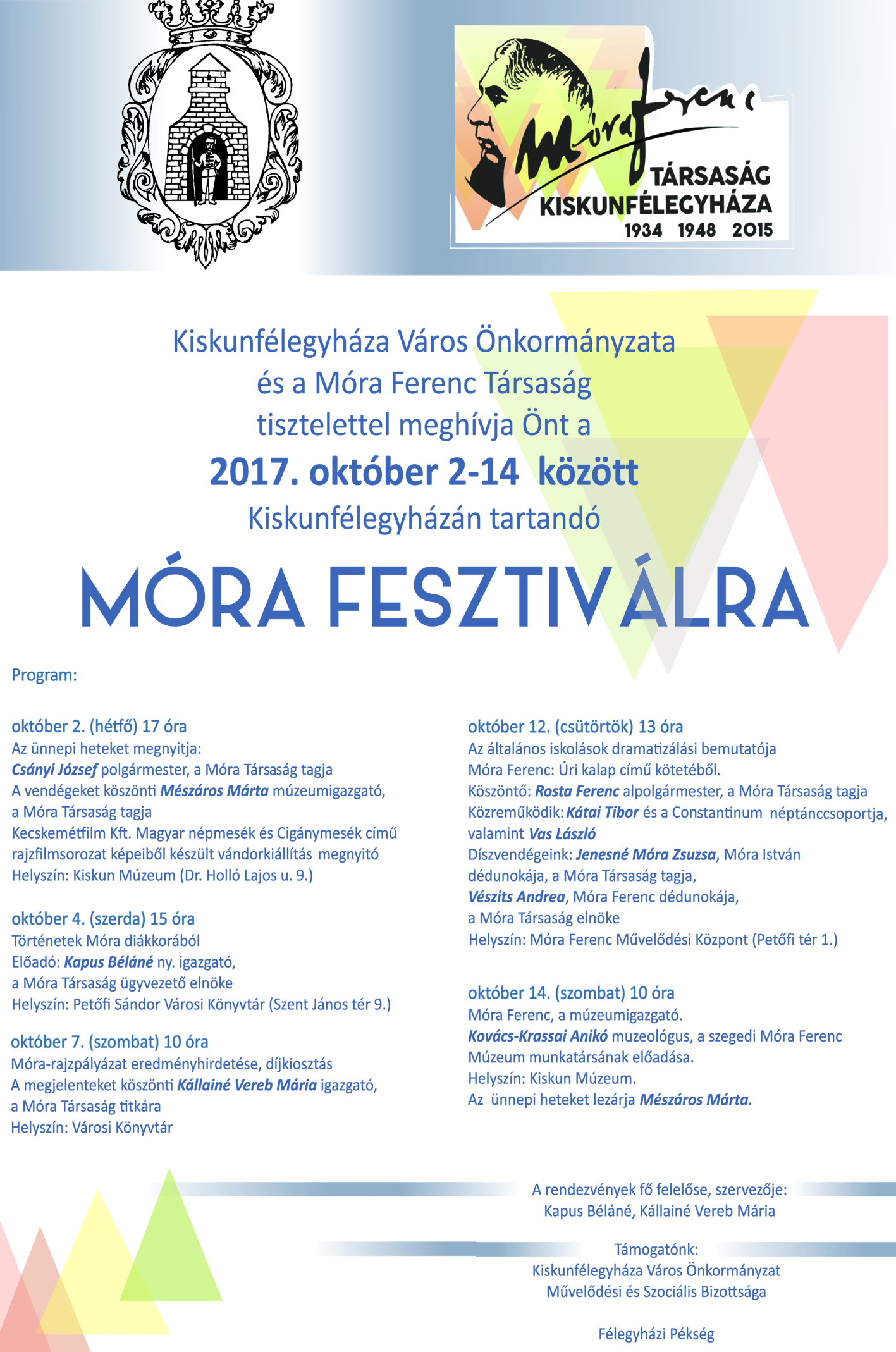 Kiskunfélegyháza Város Önkormányzata és a Móra Ferenc Társaság tisztelettel hívja és várja Önt a 2017. október 2-14 között Kiskunfélegyházán tartandó MÓRA FESZTIVÁLRA.