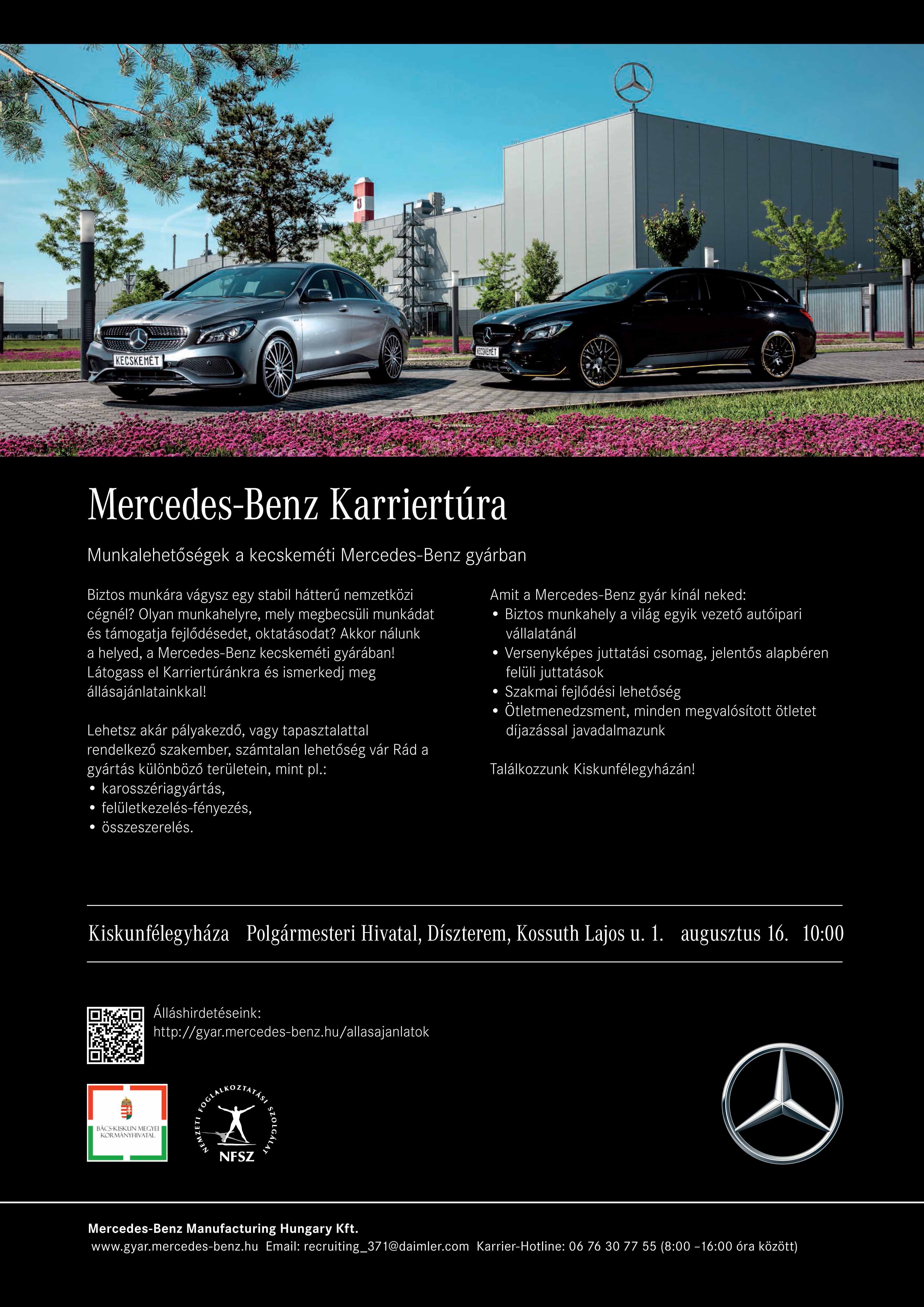 A Mercedes-Benz Manufacturing Hungary Kft. a BKMKH Foglalkoztatási Főosztályával közösen 2017. augusztus 16-án 10 órakor Karriertúrát rendez Kiskunfélegyházán a Polgármesteri Hivatal Dísztermében.