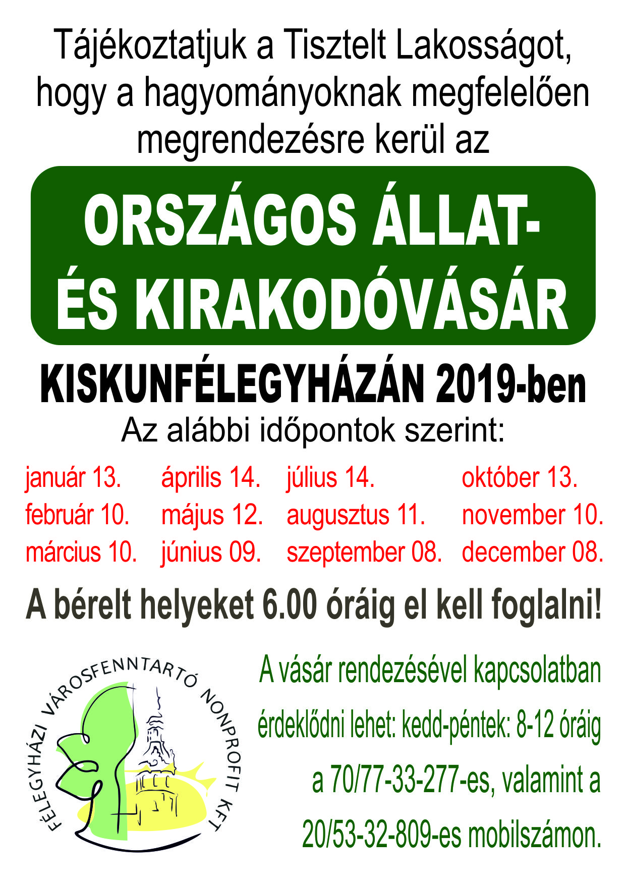 2019-ban a hagyományoknak megfelelően minden hónap második vasárnapján Országos Állat és Kirakodóvásárt tartanak Kiskunfélegyházán.