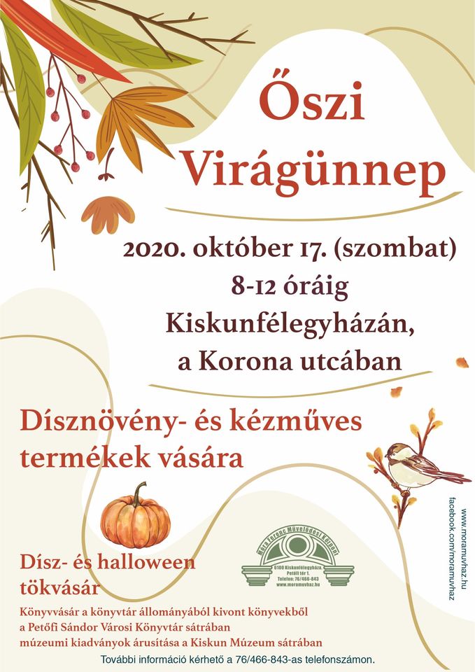 Őszi virágünnep, dísznövény- és kézműves termékek vására lesz a 2020. október 17-én, szombaton 8-12 óráig Kiskunfélegyházán a Korona utcában a Móra Ferenc Művelődési Központ szervezésében.