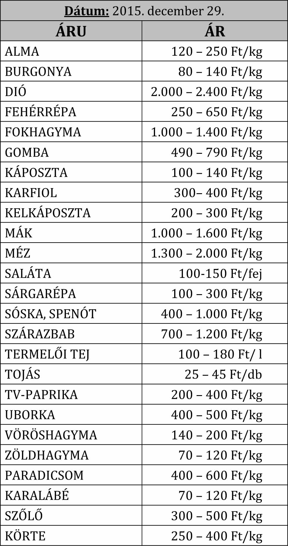 Árak a félegyházi piacon.