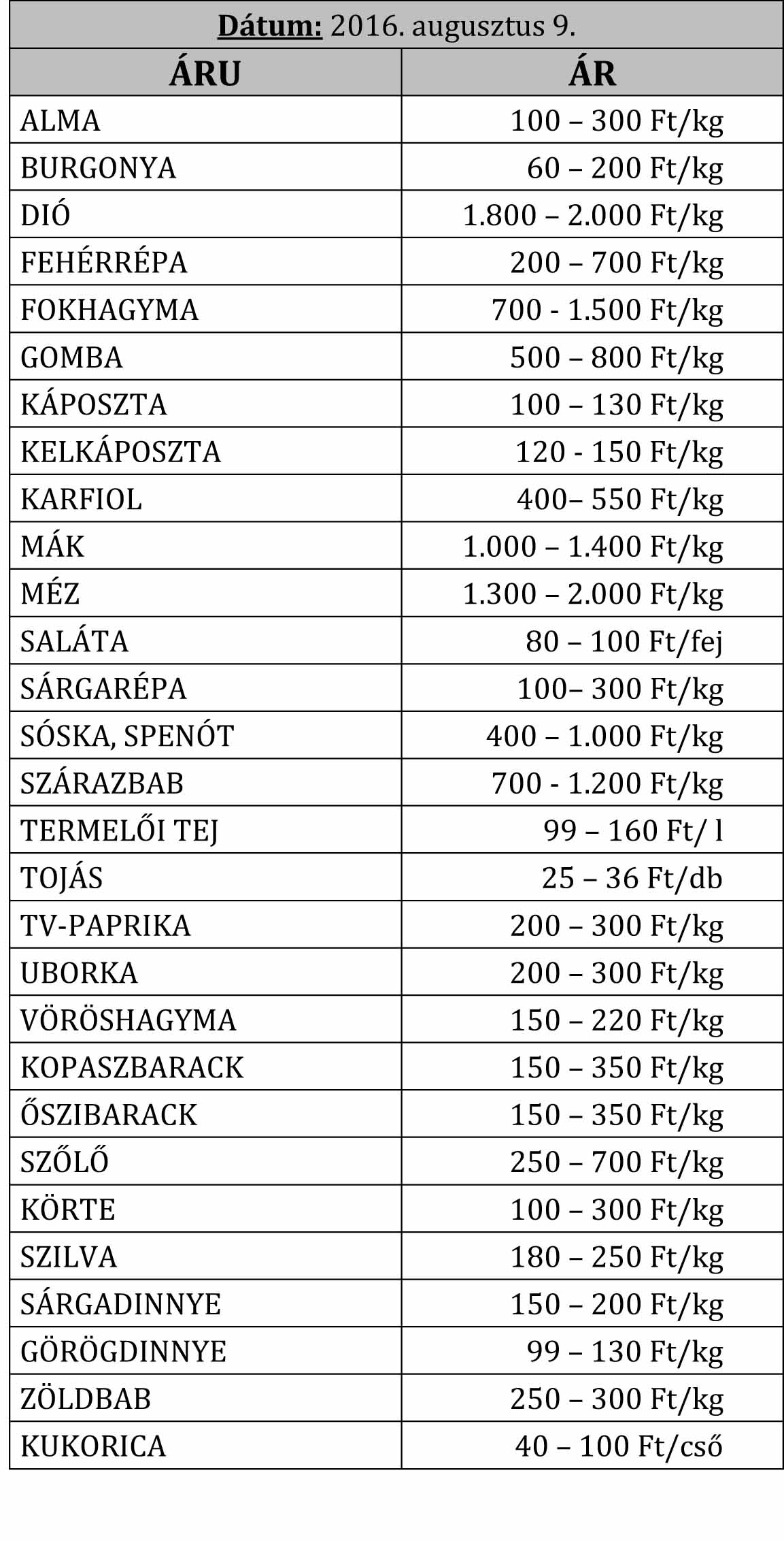 Árak a kiskunfélegyházi zöldség-gyümölcs piacról: