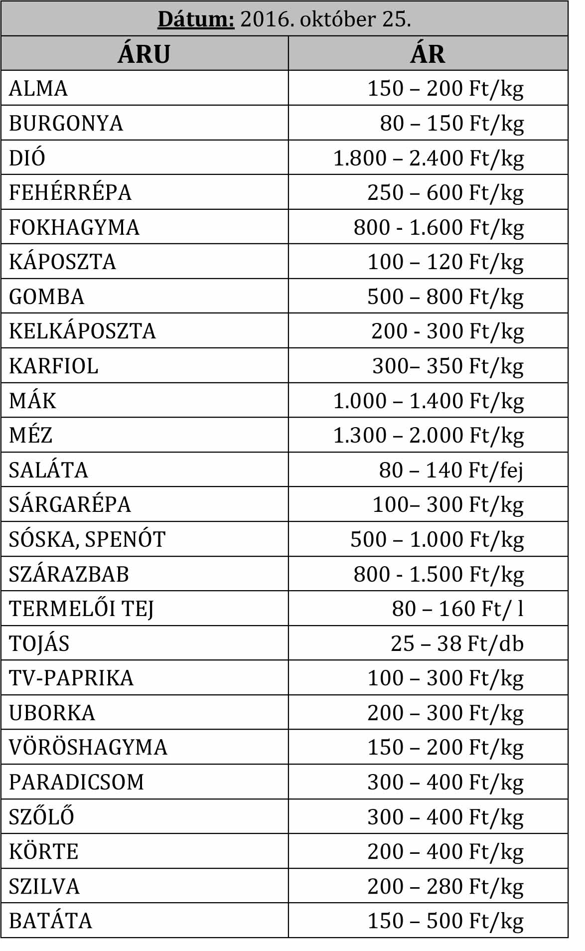 Aktuális árak a kiskunfélegyházi zöldség-gyümölcs piacról.