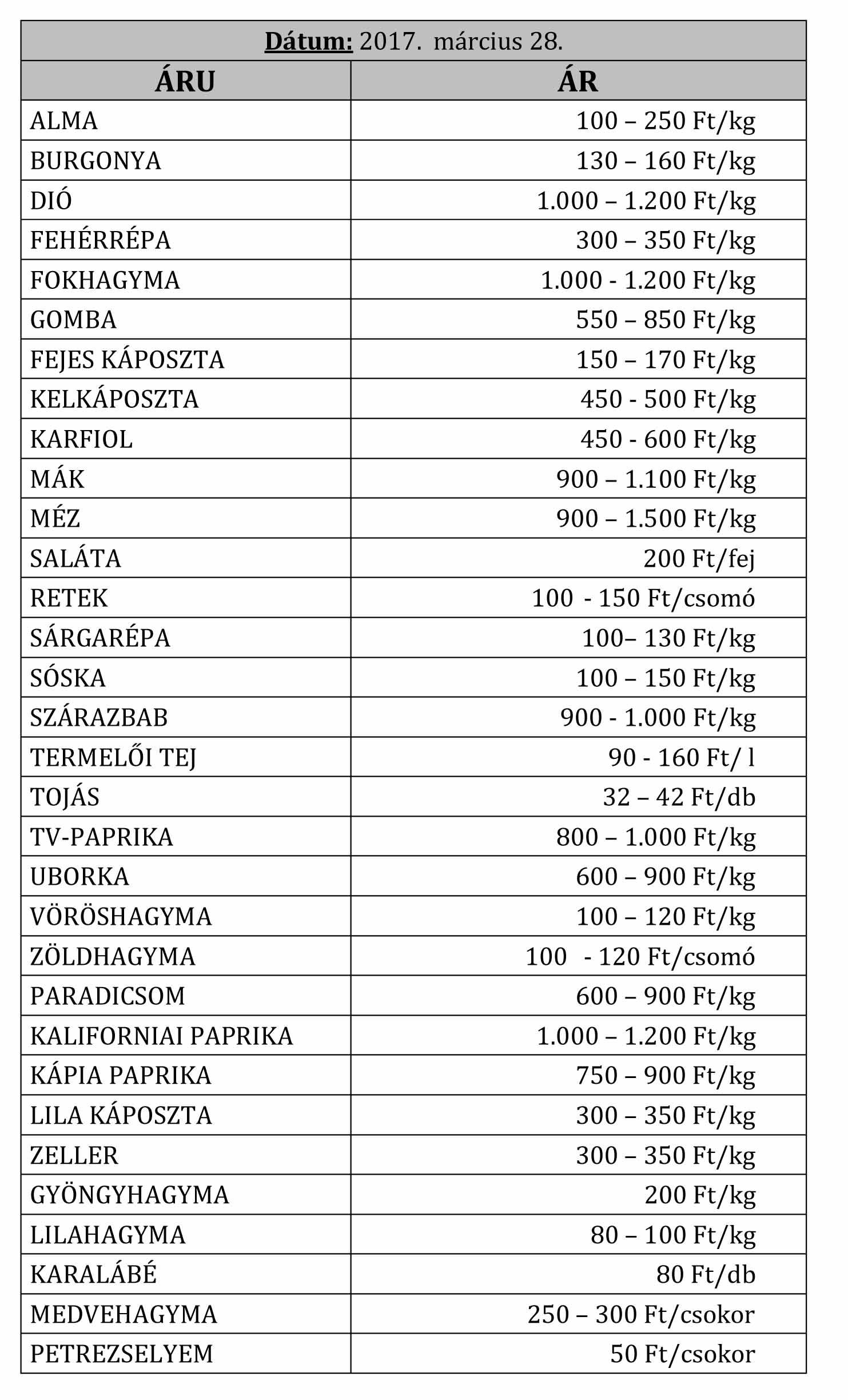 A félegyházi zöldség-gyümölcs piac aktuális árai.