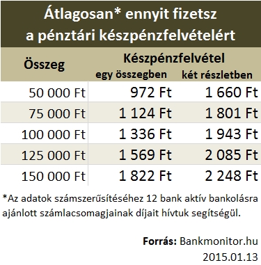 Igen jól látjuk, hogy már 50.000 Ft egy összegben történő felvétele is átlagosan közel 1.000 Ft-os költséget jelent. Ez éves szinten 12.000 Ft többletkiadást eredményez, ha a felvételt hónapról-hónapra megismételjük! Nem beszélve arról, ha ne adj Isten több részletben és/vagy nagyobb összeget veszünk fel. És persze arról se feledkezzünk meg, hogy a fenti táblázatban átlagok szerepelnek. Szélsőséges esetben még az is előfordulhat, hogy 3.100 Ft-unk bánja adott hónapban a készpénzfelvételt (150.000 Ft két egyenlő részletben történő felvételénél, ehhez azonban a vizsgálatba bevont legdrágább díjazású számlacsomaggal kell rendelkeznünk).