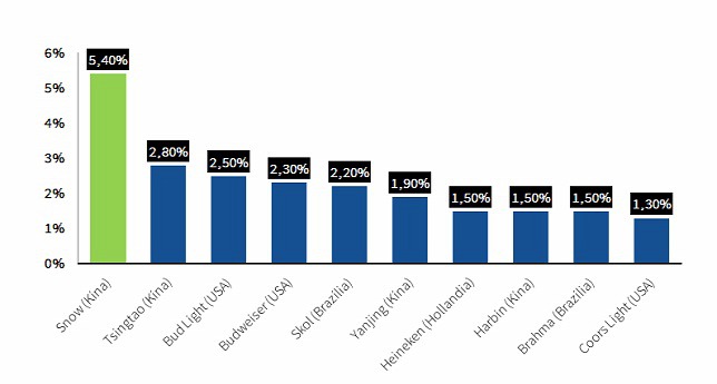 A világ 10 legjobban fogyó sörmárkája között négy kínai is van, a Snow, a Tsingtao, a Yanjing és a Harbin.
