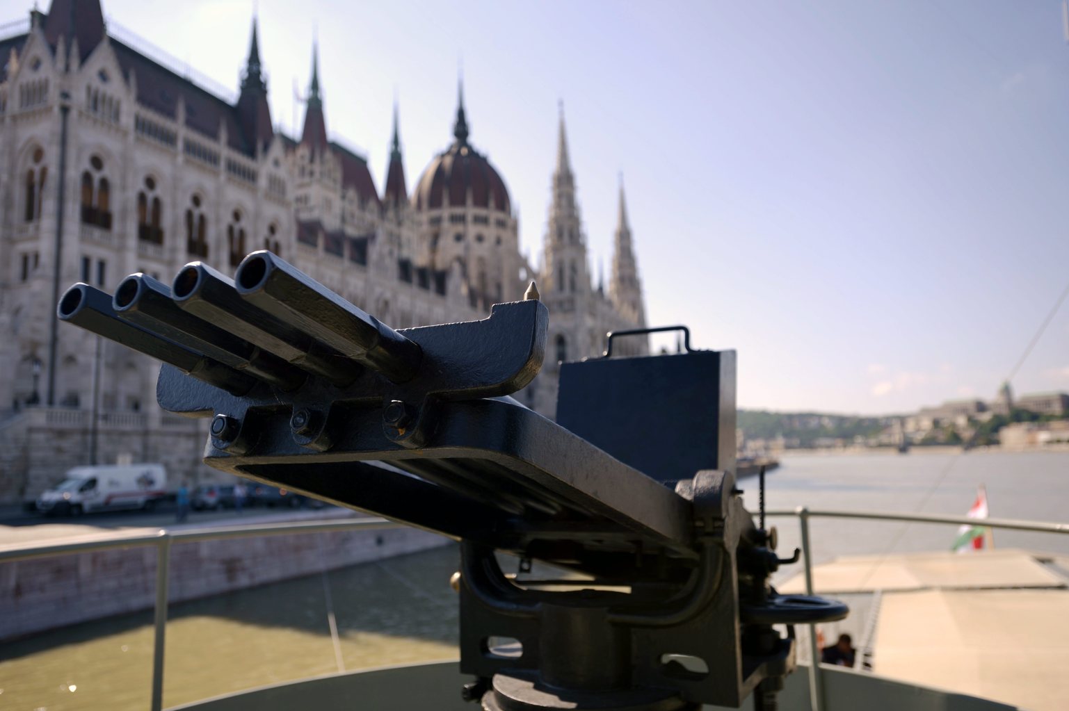 A Lajta Monitor Múzeumhajó fedélzeti géppuskája a Parlament északi részénél kialakított kikötőben (Fotó: MTI/ Beliczay László)